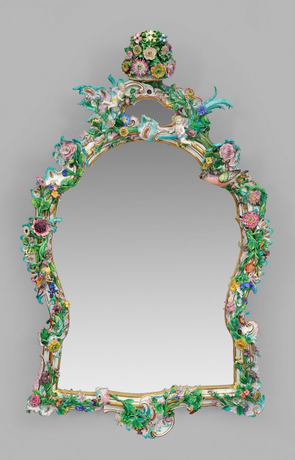 Großer Prunkspiegel mit plastischem Blumendekor auf Holz montiert. Geschweifte, profilierte Rahmung aus stark reliefplastischen Rocaillen und Blattwerk mit üppig aufgelegtem, farbenprächtigem Dekor aus dicht gesetzten, fein modellierten Blütenranken sowie Putten- und Vogelfiguren. Als Bekrönung großes, plastisch aufsteigendes Blumenbukett. Polychrome Malerei mit Goldstaffage. Entw. nach J. J. Kaendler. Minim. best.; Rest.; Schwertermarke. Ca. 140 x 86 cm.