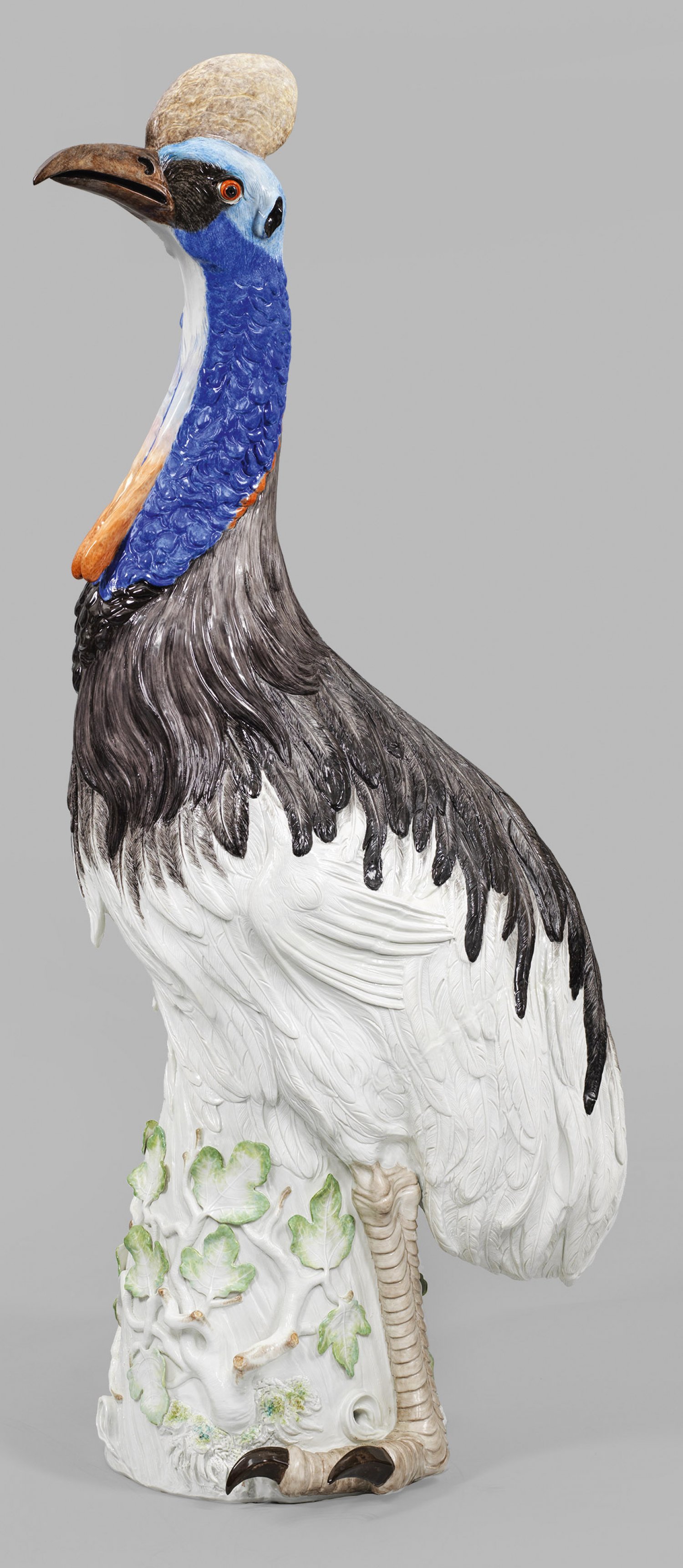 Außergewöhnliche lebensgroße Figur eines Kasuar Vollplastisch gearbeitete, majestätisch anmutende Figur eines Laufvogels, an einem, mit plastisch aufgelegtem Astwerk umzogenen Baumstumpf stehend, mit unbefiedertem, aufgerichtetem Hals und erhobenem Kopf, der von einem kreisförmigen Kamm bekrönt wird. Der spitz zulaufende, gebogene Schnabel ist leicht geöffnet. Äußerst naturalistische Gestaltung mit stark reliefplastischem Gefieder und akzentuierter, leuchtend farbiger Staffierung, welche die Farbenpracht des, in der Natur vorkommenden Helmkasuars andeutet. Polychrome Malerei. Entw. Johann Joachim Kaendler, 1732. Schwertermarke. H. 128 cm.