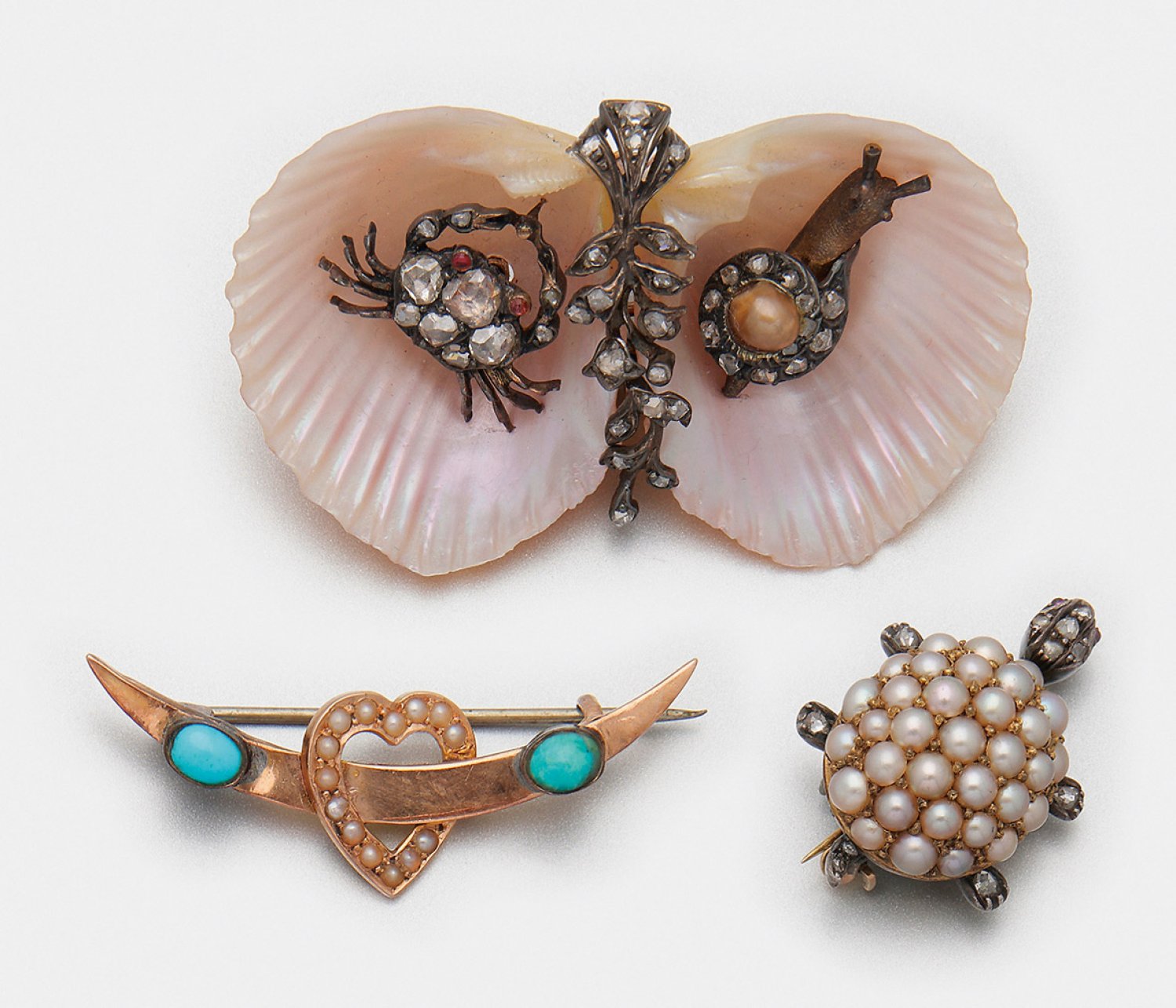 Drei viktorianische Tier- bzw. Freundschafts-Broschen Roségold 14/15 ct. und Silber. Darstellung einer Schildkröte besetzt mit Perlen einer Muschel mit Applikationen aus zwei Meerestieren besetzt mit Diamantrosen sowie einer Freundschaftsbrosche.