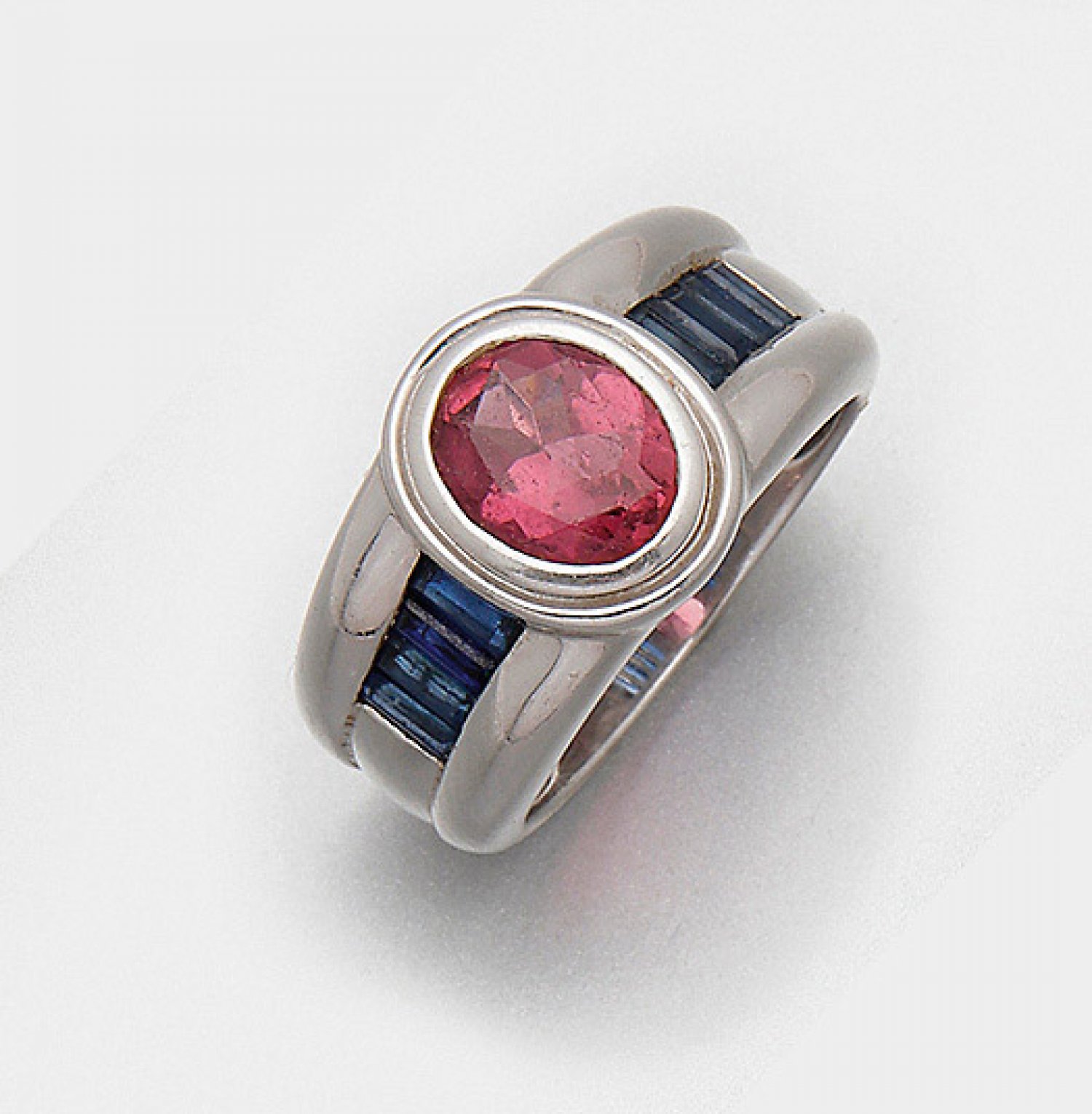 Dekorativer Bandring mit Turmalin und Saphiren Weißgold, gest. 750. Zentral besetzt mit einem pinkfarbenen Turmalin von ca. 1,50 ct. im Ovalschliff, flankiert von Saphirbaguetten von zus. ca. 0,80 ct.; Gew. ca. 8,68 g.