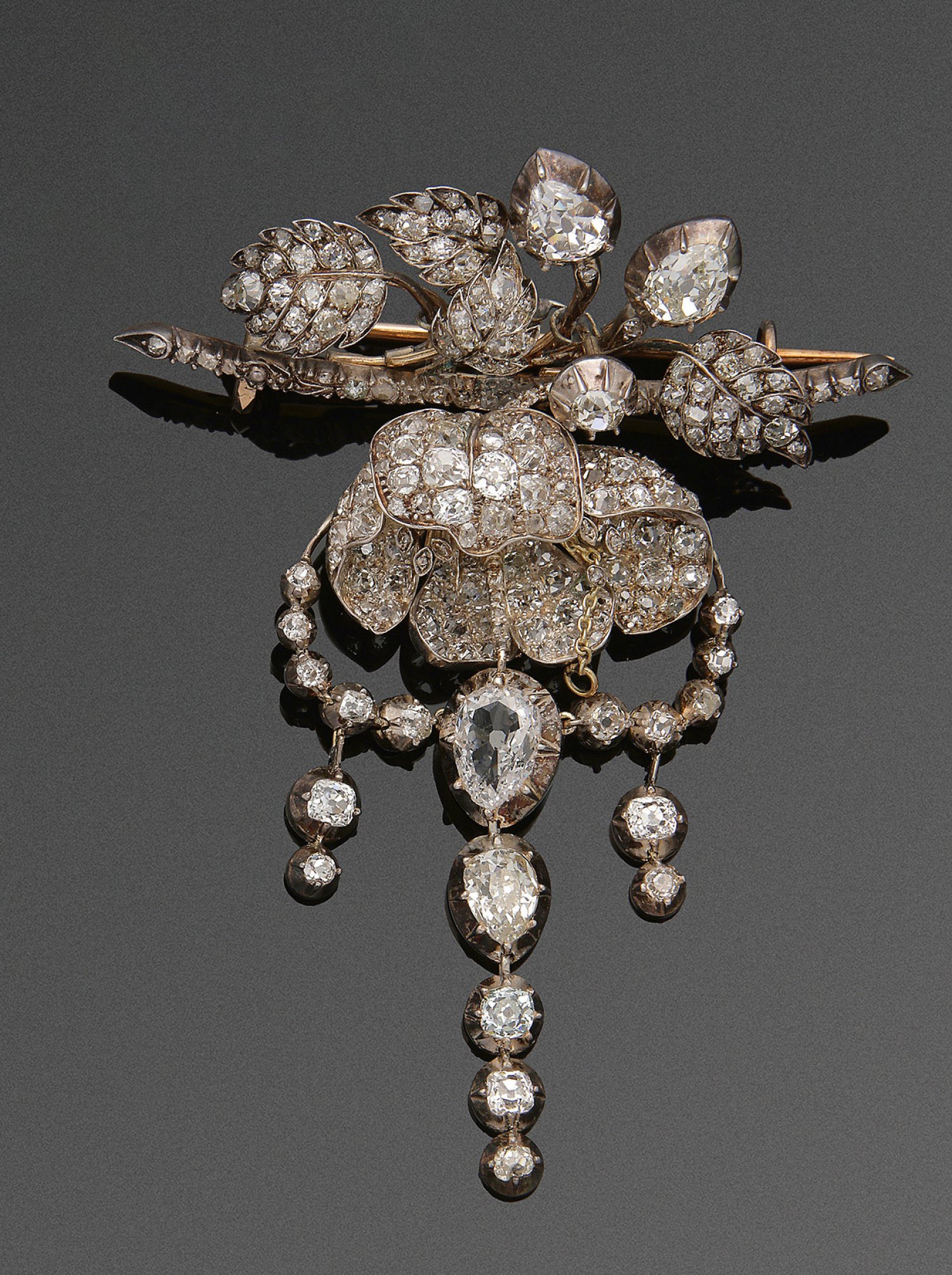 Belle Epoque-Diamantbrosche Gelbgold mit Silber doubliert, 14 ct.; Schauseitig ausgefasst mit insges. vier Altschliffdiamanten in Tropfenform von zus. ca. 2,90 ct. (wesselton(H)/pi) sowie 14 Diamanten im Kissenschliff von zus. ca. 2,10 ct. und diversen kleinen korrespondierenden Diamanten von zus. ca. 5,00 ct. (top crystal (I-L/vs-pi). Sehr feine florale Goldschmiedeausführung des 19. Jh.; Gew. ca. 20,50 g.