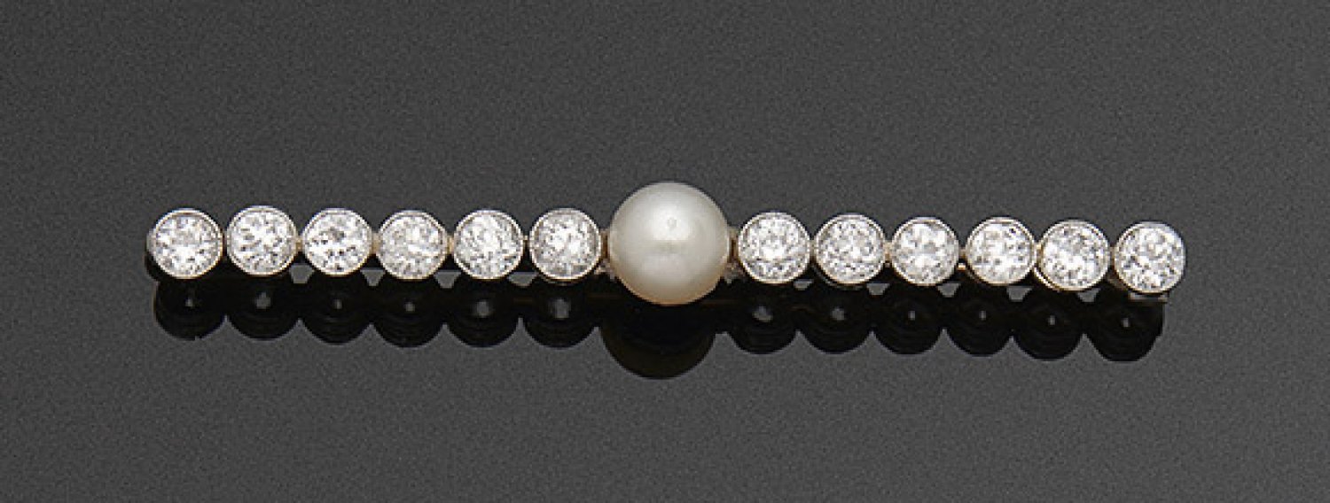 Art Déco-Stabnadel mit Diamanten Weißgold, teilw. mit Gelbgold verbödet, 18 ct.; Zentral besetzt mit einer weißen Zuchtperle, flankiert von Altschliffdiamanten von zus. ca. 1,20 ct.; Gew. ca. 4,93 g.