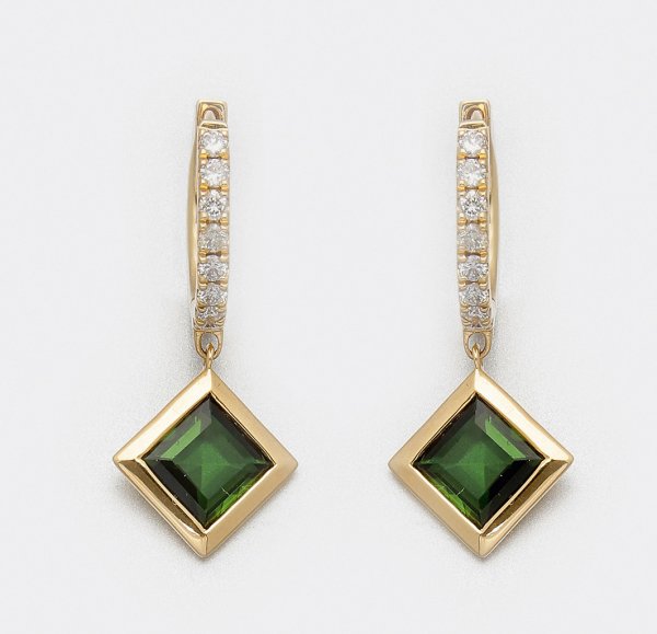 Paar feine Turmalin-Ohrringe Gelbgold gest. 750. Zentral besetzt mit zwei petrolgrünen Turmalinen von zus. ca. 1 48 ct. im Carréeschliff akzentuiert durch Brillanten von zus. ca. 0 27 ct. (H/si). Ges.-Gew. ca. 3 39 g.