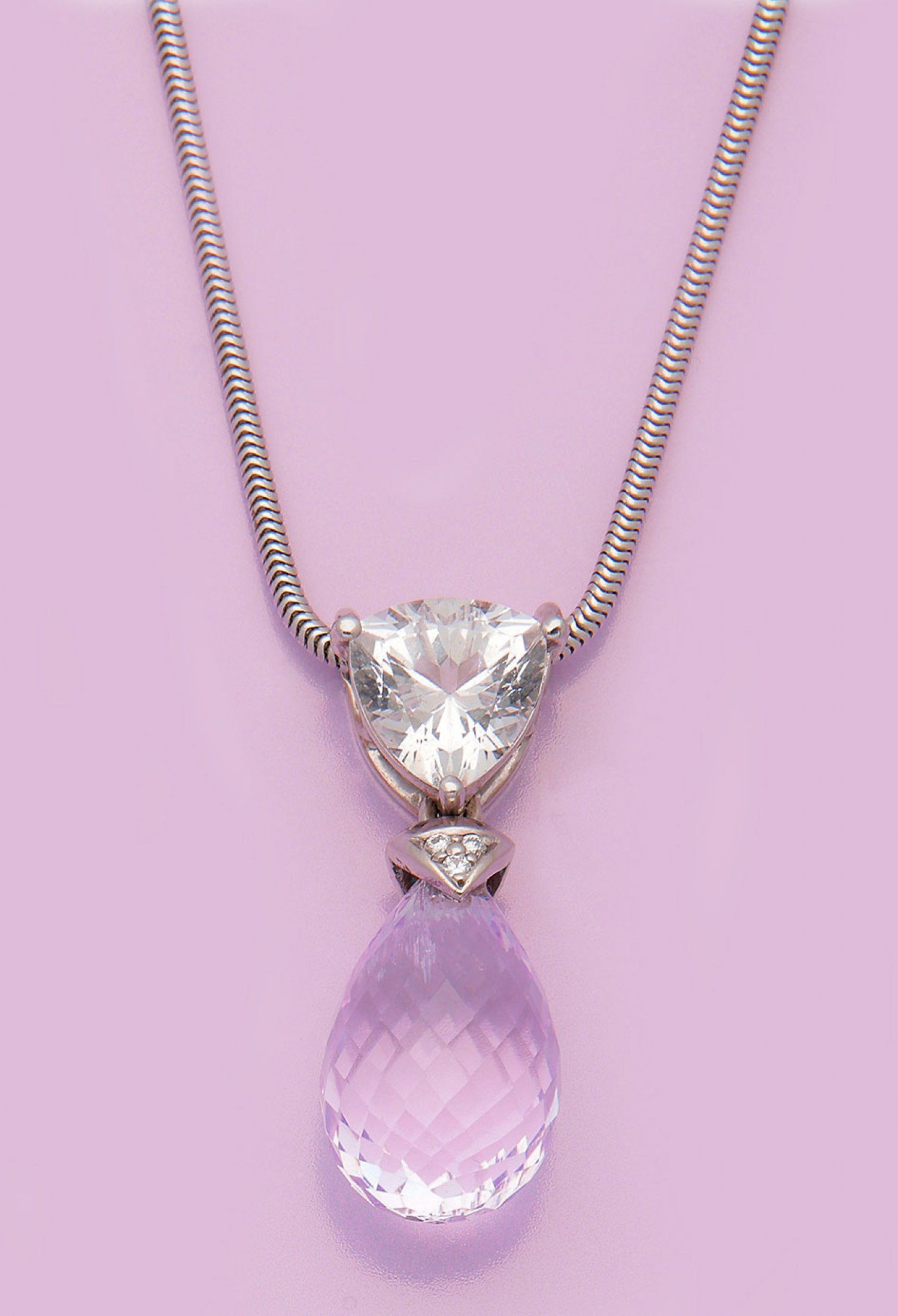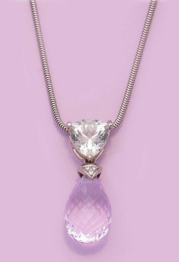 Seltener Danburit-Kunzit-Anhänger Weißgold gest. 585. Schauseitig besetzt mit einem Danburit-Trilliant unterhalb durch drei kleine Brillanten von 0 045 ct. verbunden mit einem rosafarbenem Kunzit im Brioletteschliff. Dazu feine Schlangenhaut-Kette. Ges.-Gew. ca. 13 36 g.