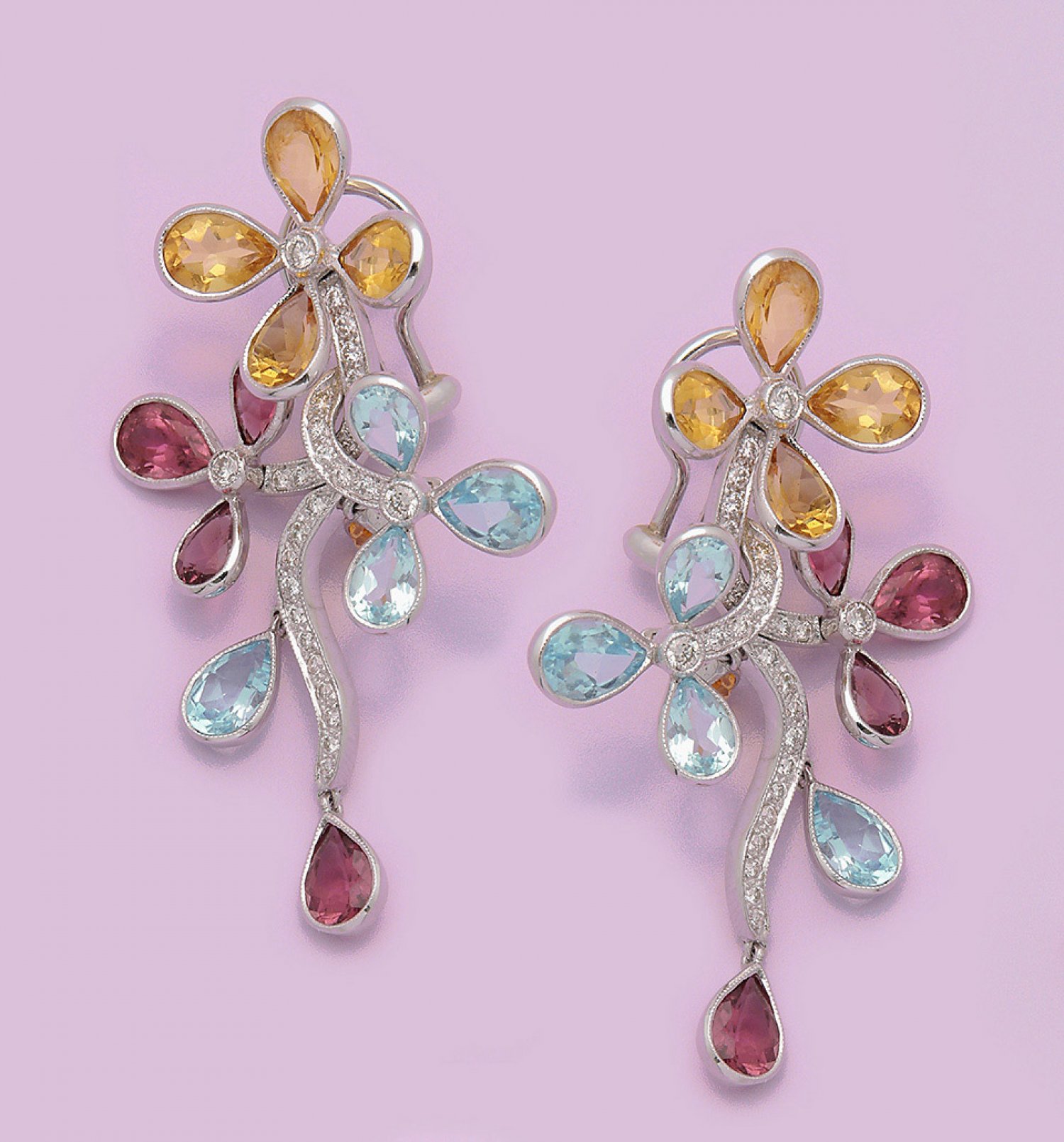 Paar charmante Multicolour-Chandeliers Weißgold, gest. 750. Schauseitig besetzt mit hellblauen Aquamarinen, goldgelben Citrinen und pinkfarbenen Turmalinen von zus. ca. 12,00 ct. und Brillanten von zus. ca. 0,80 ct.; Ges.-Gew. ca. 17,17 g.