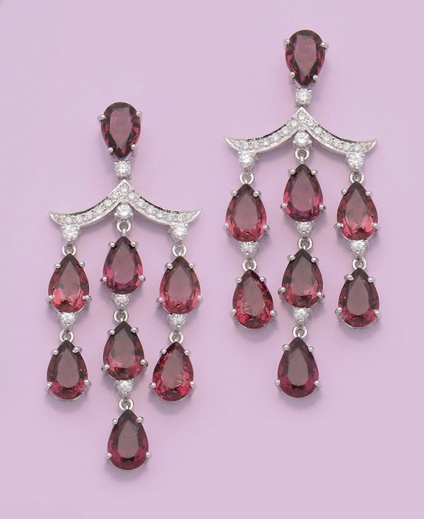 Paar repräsentative Rubellit-Chandeliers Weißgold, gest. 750. Schauseitig besetzt mit rosa-rotem Rubellit von zus. ca. 21,35 ct. im Tropfenschliff, akzentuiert durch Brillanten von zus. ca. 1,36 ct.; Ges.-Gew. ca. 22,79 g.