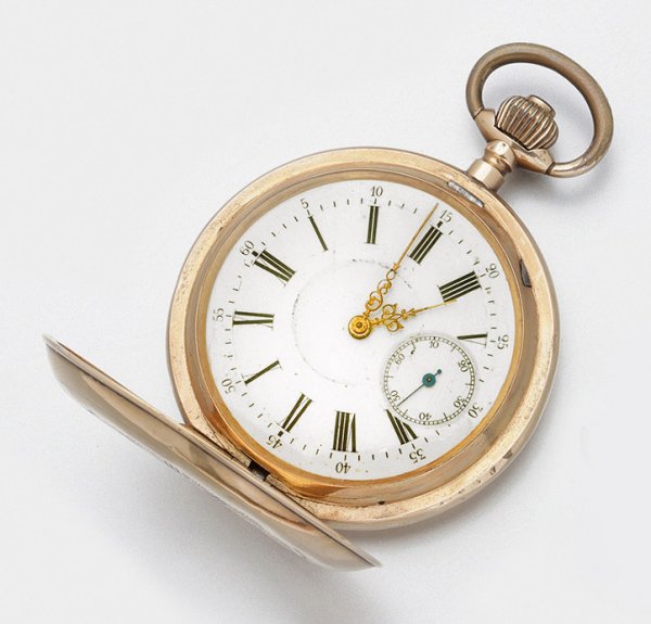um 1900 Herrentaschenuhr System Glashütte um 1900 Roségold gest. 585. Rundes Zweideckel-Uhrengehäuse mit fein guillochiertem Zifferring und schwarzen römischen Zahlen weißes korrespondierendes Emailzifferblatt mit goldenen Breguet Zeigern. Mechanisches Werk mit Handaufzug. Gew. ca. 91 77 g.