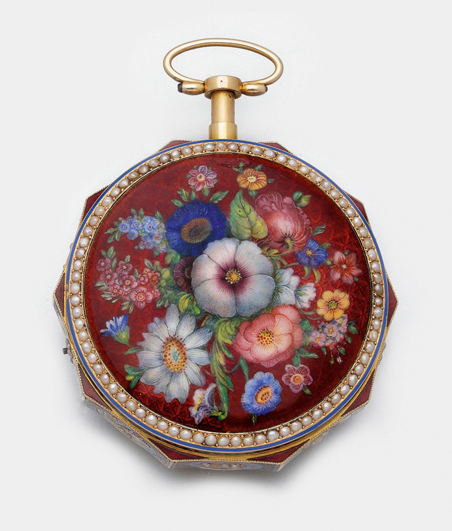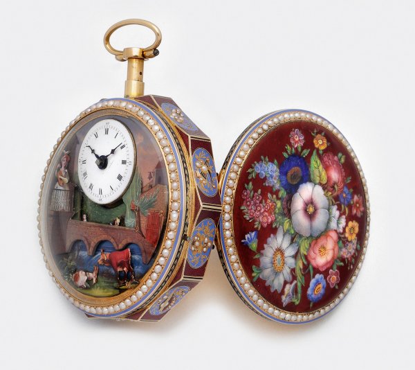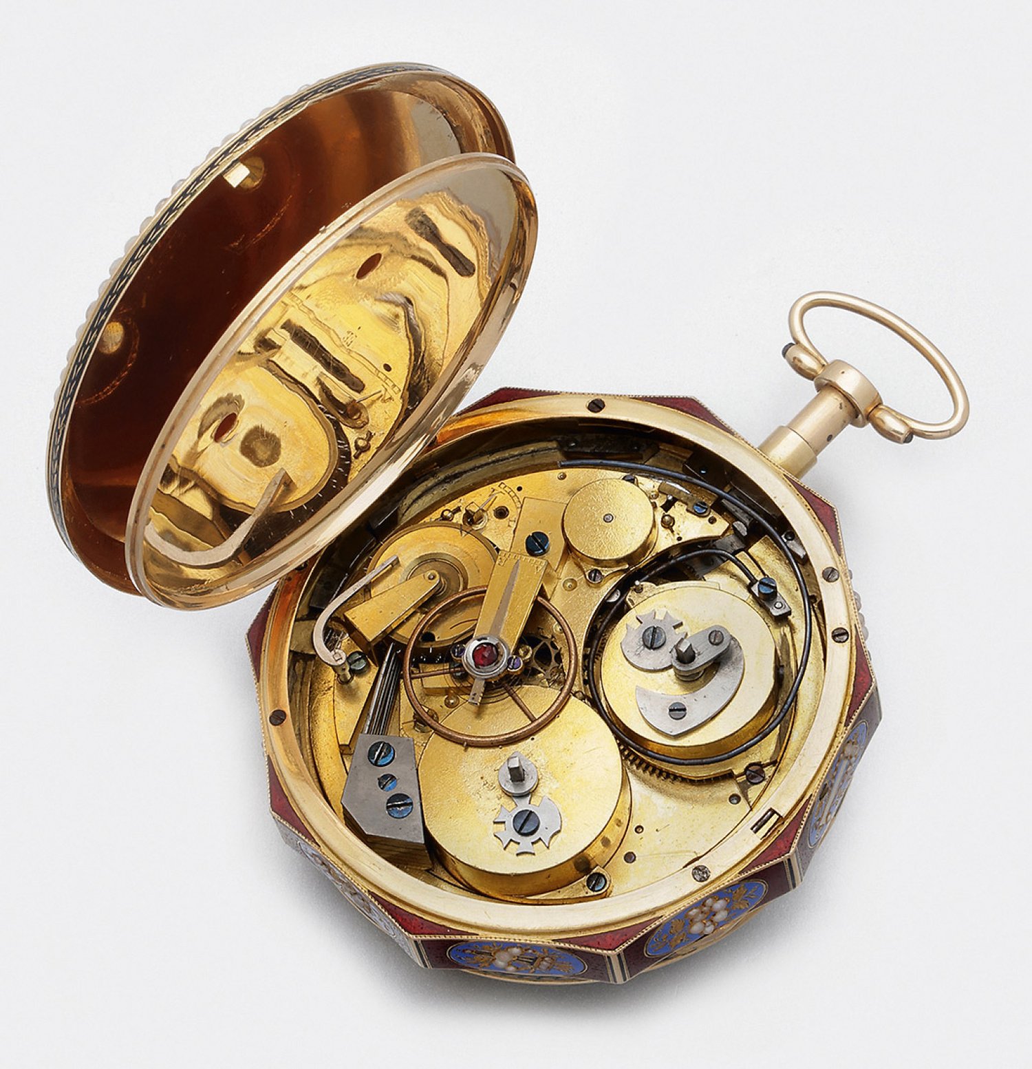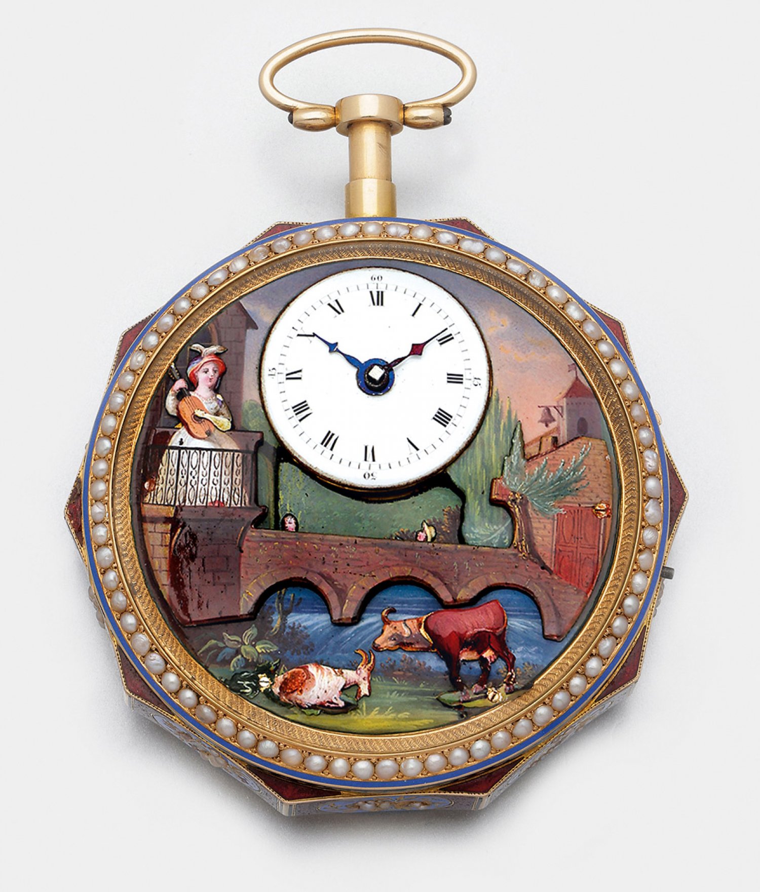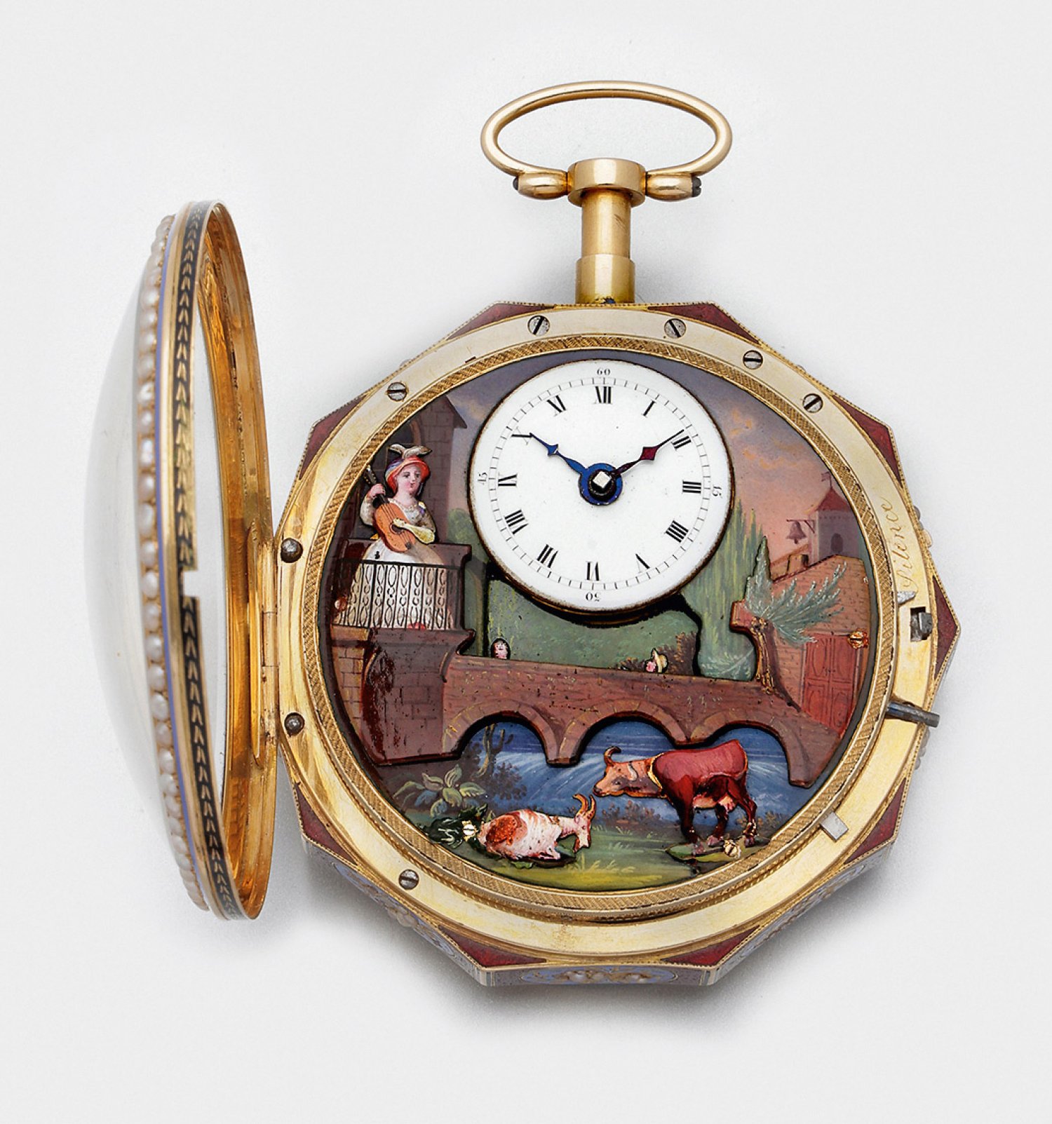 Exquisite Goldemail-Taschenuhr mit Musikspielwerk Figurenautomat und Viertelstunden-Repetition. Wohl Jaquet Droz Geneve. Um 1800.