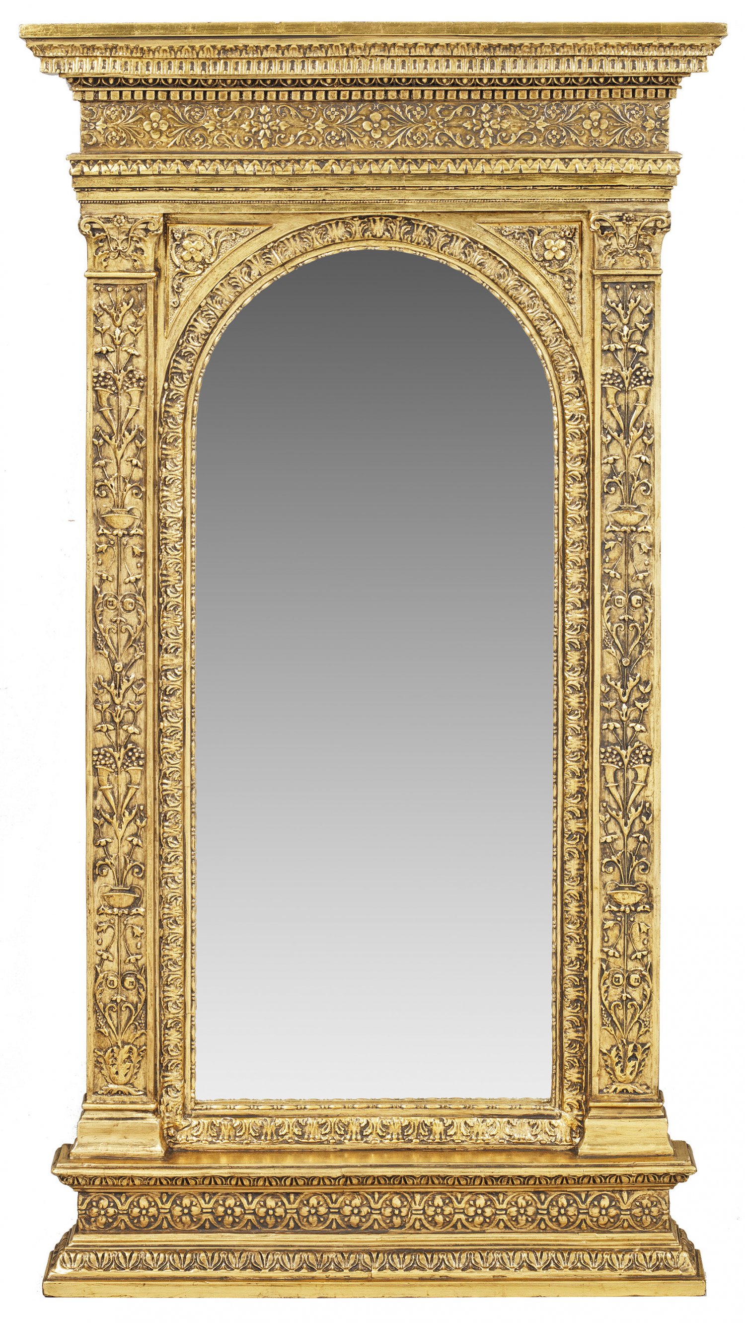 Großer Pfeilerspiegel Holz, stuckiert und vergoldet. Architektonisch gegliederte Spiegelrahmung aus breiten, üppig reliefierten Pilastern mit segmentförmigem oberen Abschluss. Oberhalb breites, gestaffelt angeordnetes Gesims. Rest.; 143 cm x 78 cm.