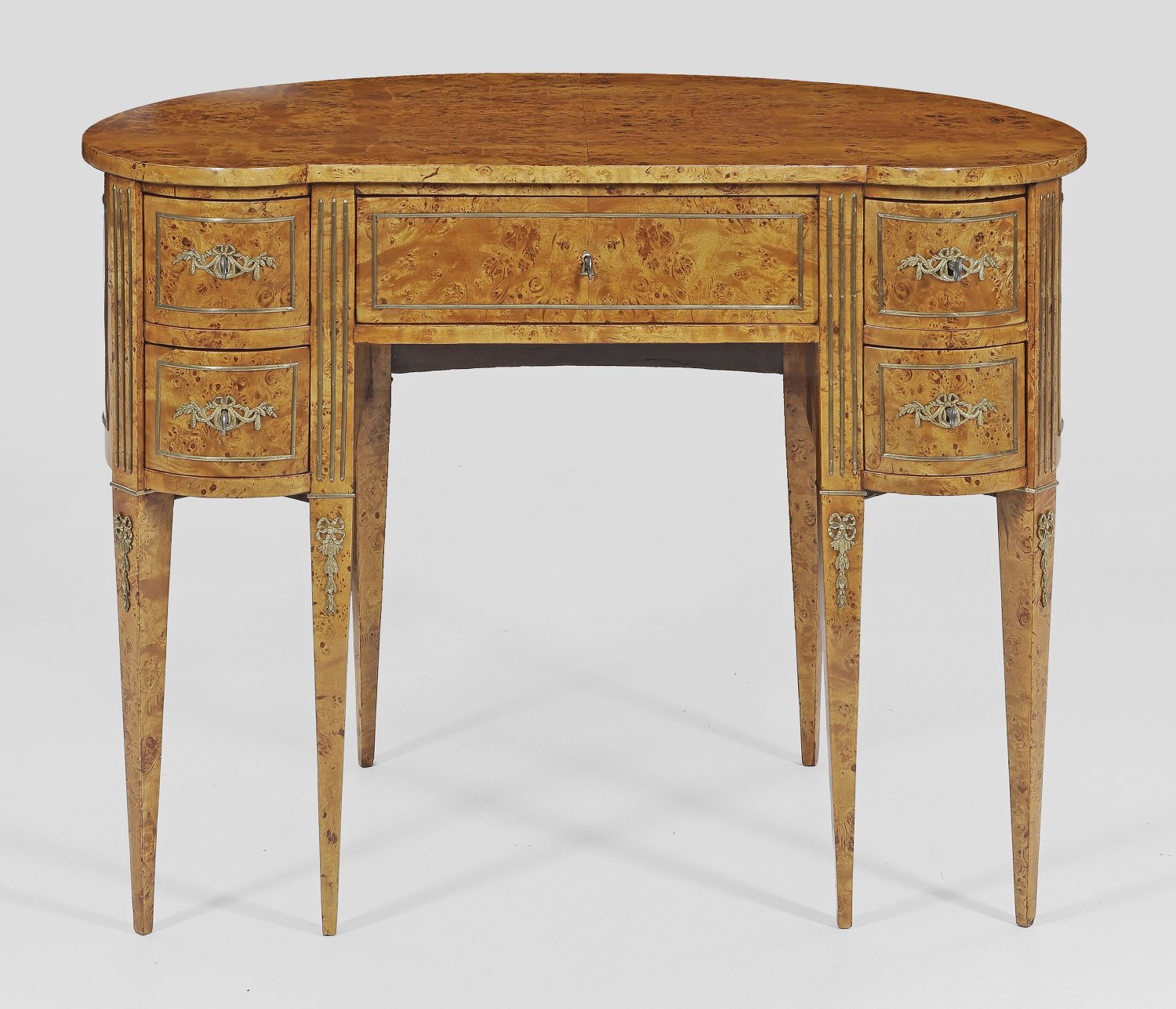 Kleiner Louis XVI-Salonschreibtisch Birkenmaser furniert sowie Applikationen aus Messing. Bombierter Korpus auf hohen konischen Vierkantbeinen. In der gegliederten Front gekantetes Kniefach sowie fünf Schubladen unterschiedlicher Größe. Gering überstehende nierenförmige Deckplatte. Flächendeckend profilgerahmte Furnierfelder. H. 78 cm. 105 cm x 56 cm.