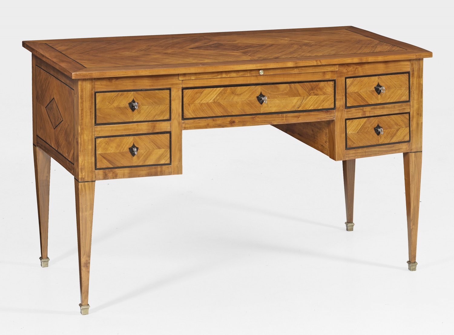 Biedermeier-Schreibtisch Kirschbaum furniert. Gerader rechteckiger Korpus auf konischen Vierkantbeinen. In der gegliederten Front gekantetes Kniefach umgeben von fünf Schubladen unterschiedlicher Größe und ausziehbare Ablagefläche sowie rückseitig entsprechende Blendschubladen. Allseitig gespiegelt angeordnete Furnierfelder. H. 79 5 cm. 132 cm x 62 cm.