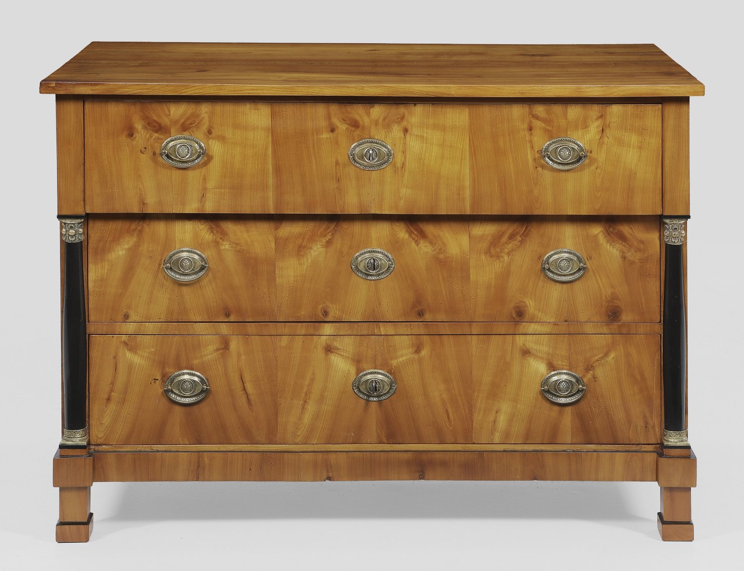 Biedermeier-Kommode Kirschbaum furniert sowie teilw. ebonisiert. Gerader querrechteckiger Korpus auf gekanteten Füßen. In der gegliederten Front drei breite teilw. vorkragende Schubladen flankiert von eingestellten Halbsäulen. Gering überstehende Deckplatte. H. 84 cm. 120 cm x 59 5 cm.