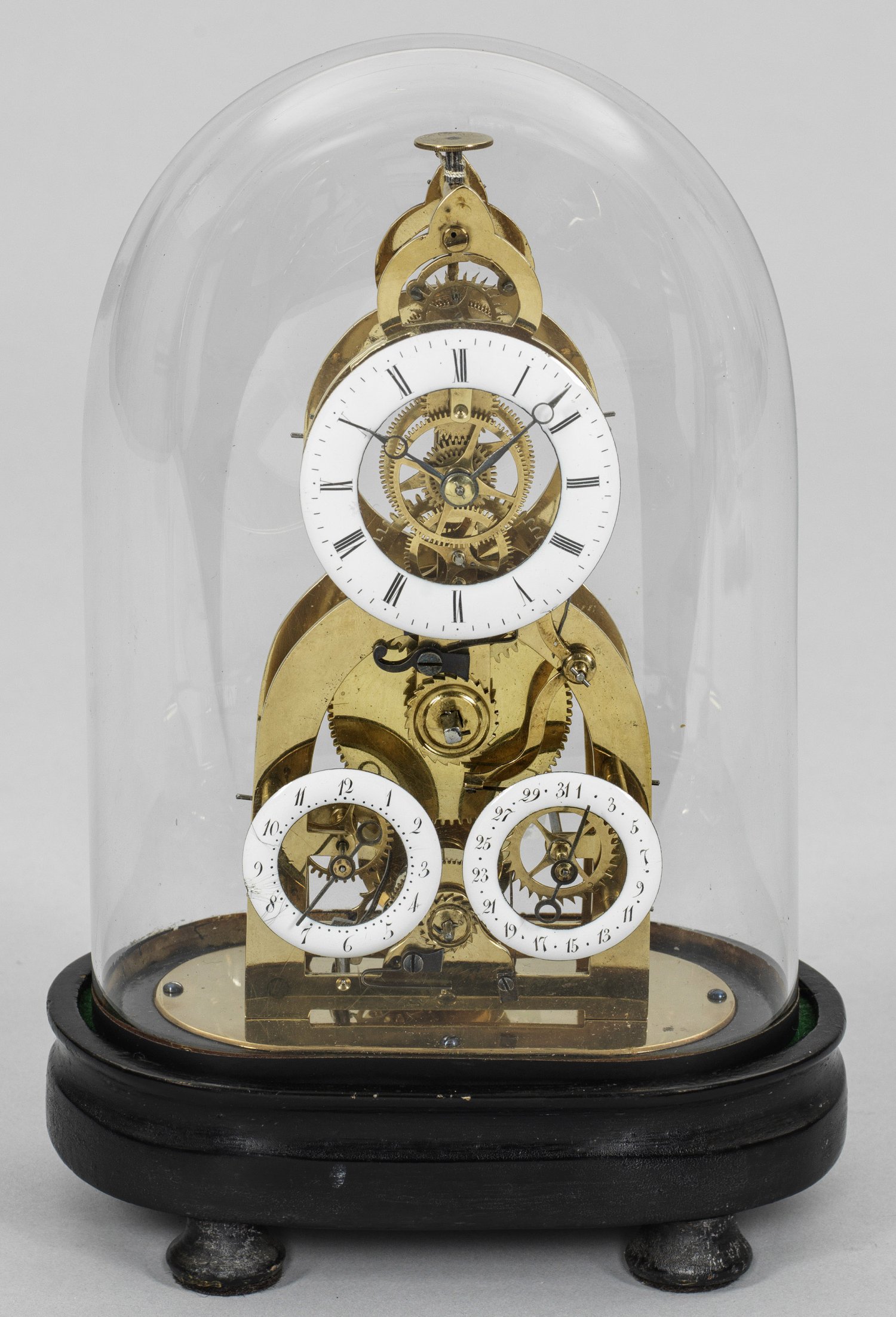 Messing, poliert. Offen gestalteter Korpus mit sichtbarem Räderwerk, Fadenaufhängung und Ankerhemmung. Emailziffernring sowie korrespondierende Datumsanzeige und Kurzzeitmesser mit schwarzen, arabischen und römischen Zahlen, teilw. minim. besch. gebläute, sog. Breguetzeiger. 8-Tage Gangdauer. Bodenseitige Glocke. Unterhalb ovaler, ebonisierter Holzsockel auf gedrückten Balusterfüßen. Glasglocke. Ges.-H. 24,5 cm. 16,5 cm x 11 cm.
