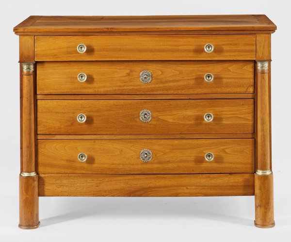 Große Biedermeier-Kommode Nussbaum, furniert. Gerader, querrechteckig angelegter Korpus, flankiert von eingestellten Halbsäulen mit reliefierten Basen und Kapitell auf kräftigen Rundfüßen. In der gegliederten Front vier breite, teilw. vorkragende Schubladen unterschiedlicher Größe. Rest. mit Erg.; H. 93 cm. 123 cm x 59 cm.