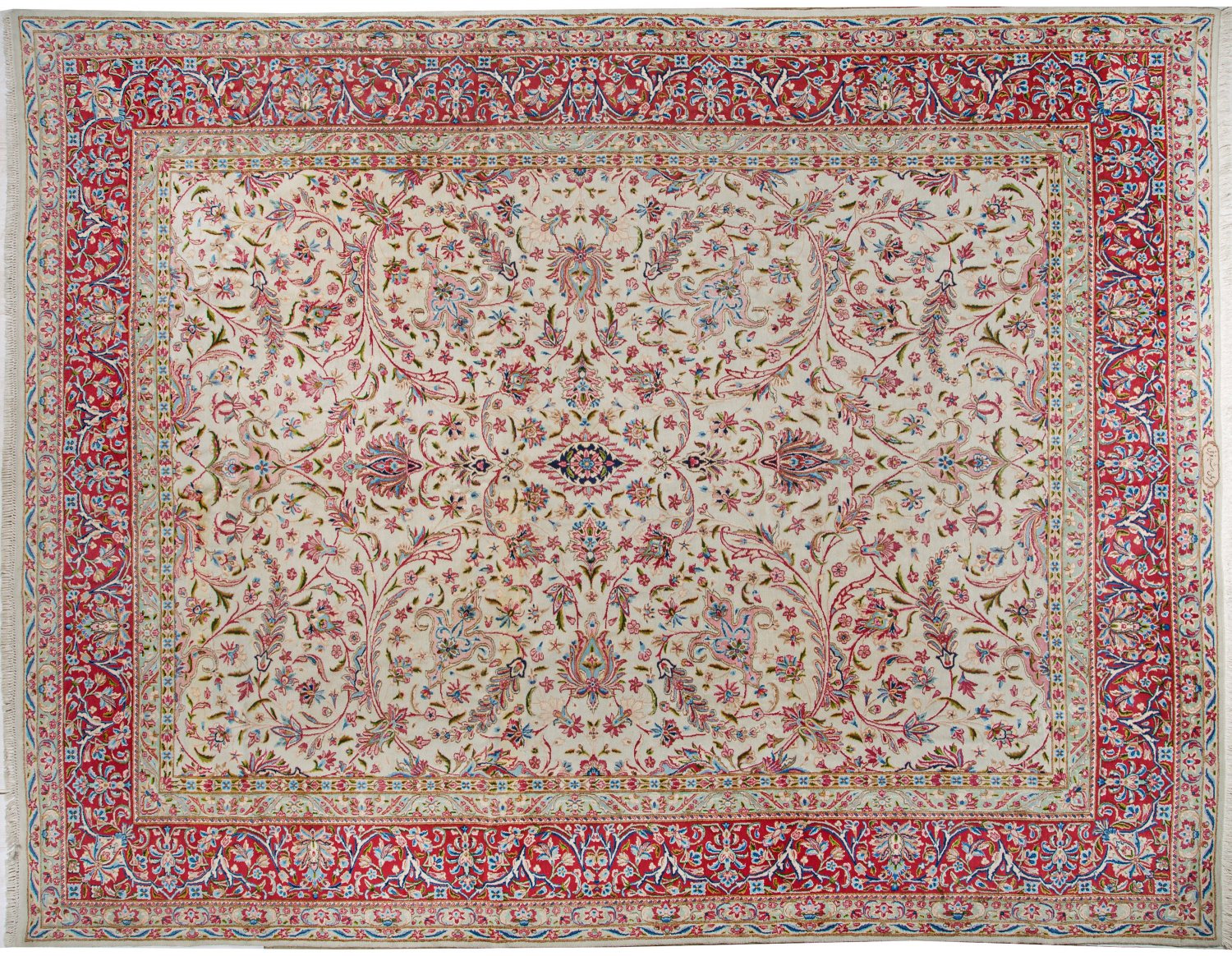 Großer signierter Kirman Laver-Teppich Persien. Mitte 20. Jh.; Wolle auf Baumwolle. Im elfenbeinfarbenen Innenfeld flächendeckende Musterung aus großzügig angelegten Blattranken in unterschiedlichen Rosétönen. Umlaufend breite, hellrote Hauptbordüre aus Palmettenranken, flankiert von schmalen Nebenbordüren. Sign.; 305 cm x 390 cm.