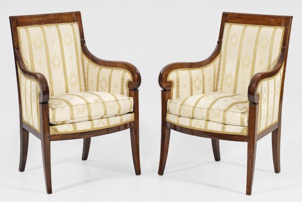 Paar Biedermeier-Sessel Mahagoni. Trapezförmige teilw. bombierte Zarge auf leicht ausgestellten Beinen in kurze Stützen für schmale volutenförmige Armlehnen übergehend. Rechteckige leicht zurückschwingende Rückenlehne. Allseitig gepolstert und bezogen. H. 94 cm. 66 cm x 51 cm. Sitz-H. 48 cm.