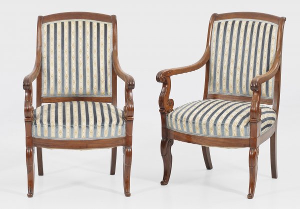 Paar Charles X-Armlehnsessel Mahagoni. Trapezförmige teilw. bombierte Zarge auf leicht ausgestellten Beinen. Volutenförmige Stütze für schmale geschweift ansteigende Armlehnen sowie rechteckige Rückenlehnenrahmung. Gepolstert und bezogen. Sitz-H. 42 cm.