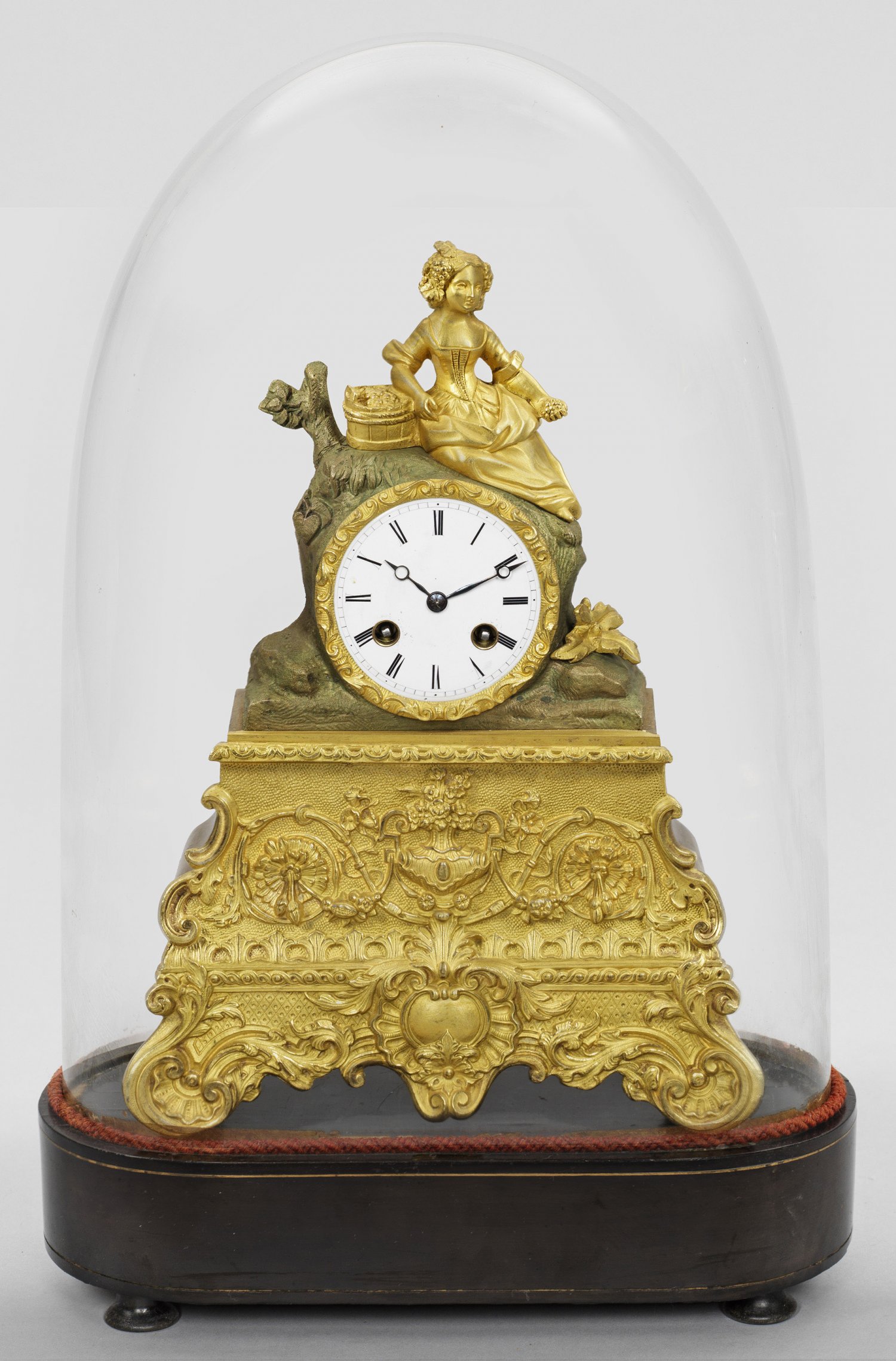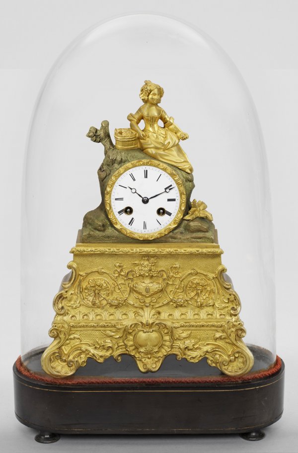 Spätbiedermeier-Pendule mit Glassturz Bronze vergoldet und teilw. grün patiniert. Über geschweift ansteigendem schauseitig üppig reliefiertem Sockel naturalistisch gestaltetes Uhrengehäuse mit plastischer Bekrönung in Gestalt eines jungen Mädchens bei der Weinlese. Profilgerahmtes Zifferblatt sowie Pendulenwerk mit Fadenaufhängung und Halbstundenschlag auf Glocke. Holzsockel und Glassturz. Ges.-H. 46 cm. 38 cm x 14 5 cm.