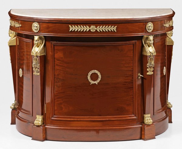 Große Demi Lune-Anrichte im Empire-Stil Mahagoni furniert. Bombierter Korpus gegliedert durch eingestellte Karyatiden mit Pharaonenköpfen auf verkröpftem Sockel. In der Front große profilierte Tür mit appliziertem Kranzmotiv. Oberhalb entsprechendes Gesims sowie profilgerahmte Deckplatte aus weißem hellgrau gemasertem Marmor. H. 86 cm. 125 cm x 63 cm.