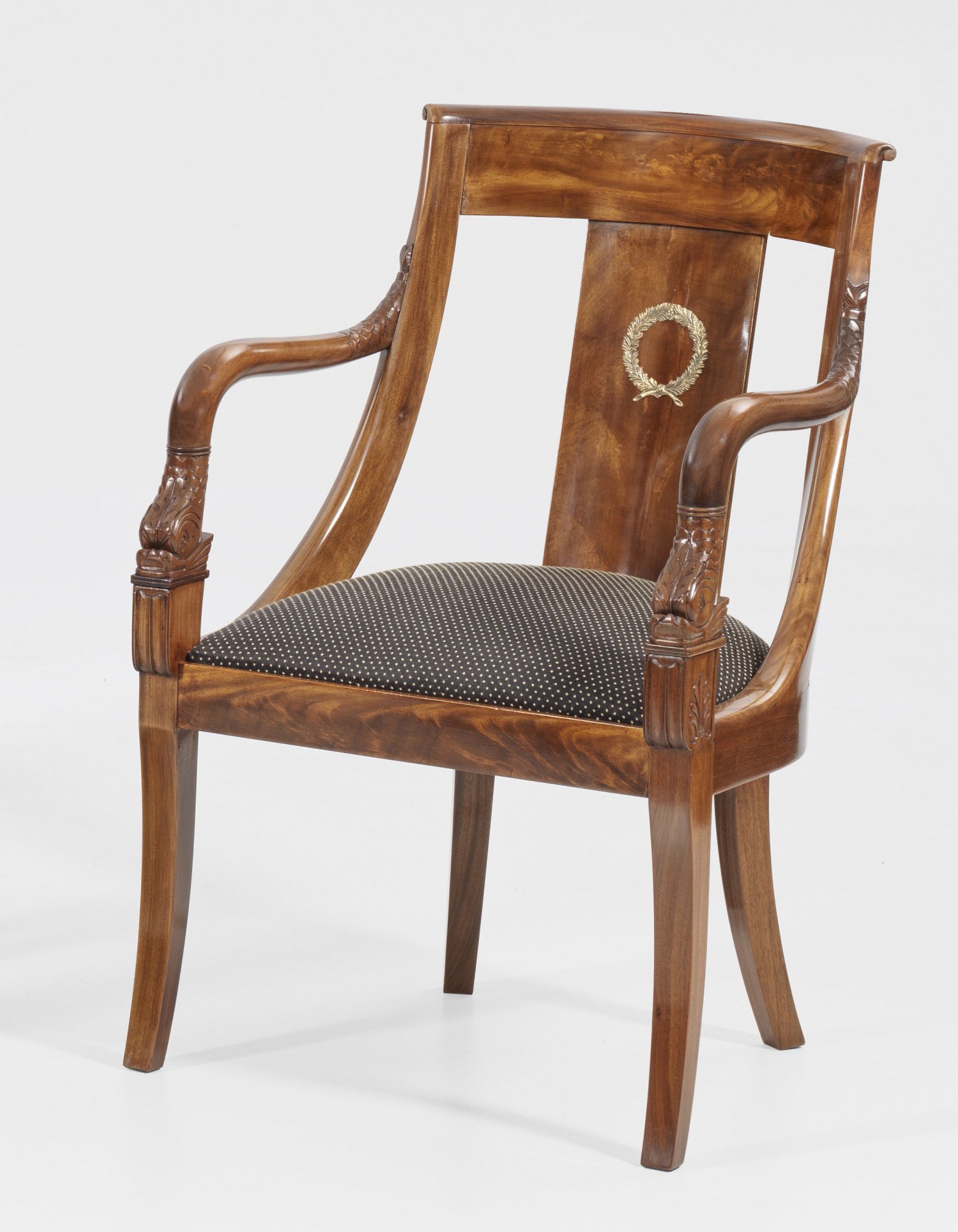 Großer Armlehnstuhl im Empire-Stil Mahagoni massiv und furniert. Hufeisenförmige Zarge auf leicht ausgestellten Vierkantbeinen. Reliefplastisch gestaltete Dephine in geschwungene Armlehnen übergehend. Gewölbte Rückenlehnenrahmung mit breitem Mittelsteg. Sitzfläche gepolstert und bezogen. Sitz-H. 44 cm.
