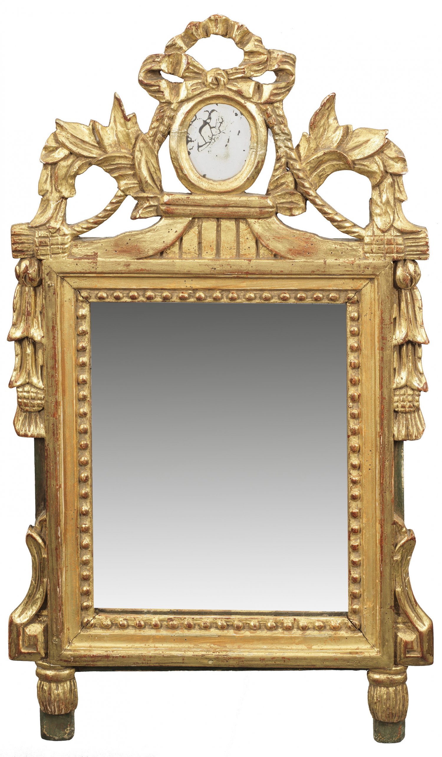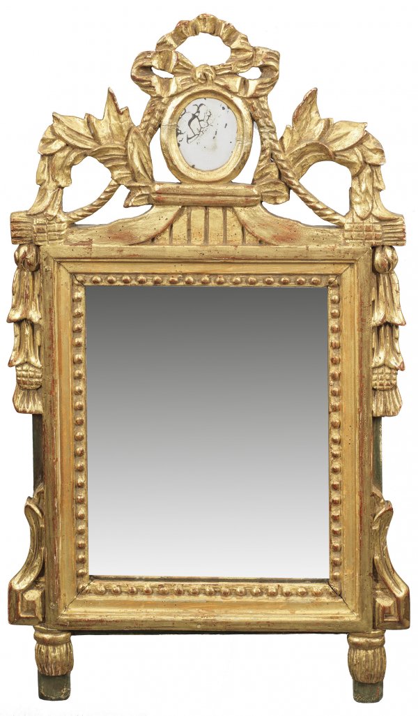 Gustavianischer-Wandspiegel Holz geschnitzt teilw. grün gefasst und vergoldet. Hochrechteckige profilierte Spiegelrahmung mit Perlstab sowie durchbrochen gearbeitete Bekrönung aus zentralem Medaillon reliefierten Festons und Kordelband. 64 cm x 37 cm.
