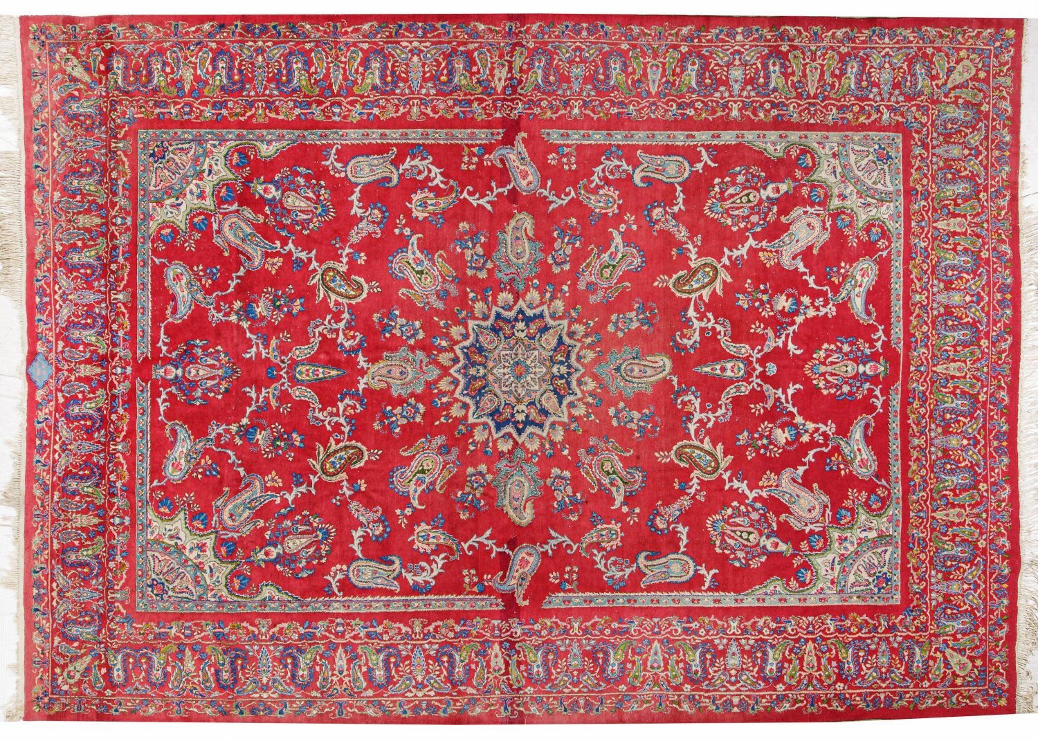 Großer signierter Kirman-Teppich Persien. Mitte 20. Jh.; Wolle auf Baumwolle. Im leuchtend roten Innenfeld Zentralmedaillon und kleine Ecklösungen sowie flächendeckende Musterung aus großen Bothéblüten. Umlaufend breite, korrespondierende Bordüre. Sign.; Teilw. nachgeknüpft. 247 cm x 349 cm.
