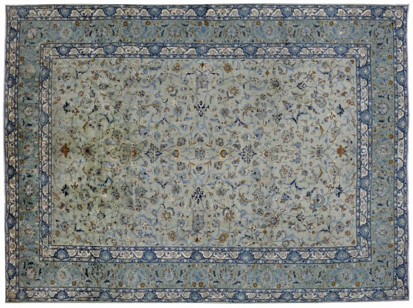 Großer signierter Keschan-Teppich Persien. Mitte 20. Jh.; Wolle auf Baumwolle. Im seladongrünen Innenfeld flächendeckende Musterung aus üppigem Rankenwerk in Blautönen. Umlaufend entsprechend abgedunkelte Hauptbordüre, flankiert von schmalen Bändern. Sign.; Besch. und partiell nachgeknüpft. 304 cm x 406 cm.