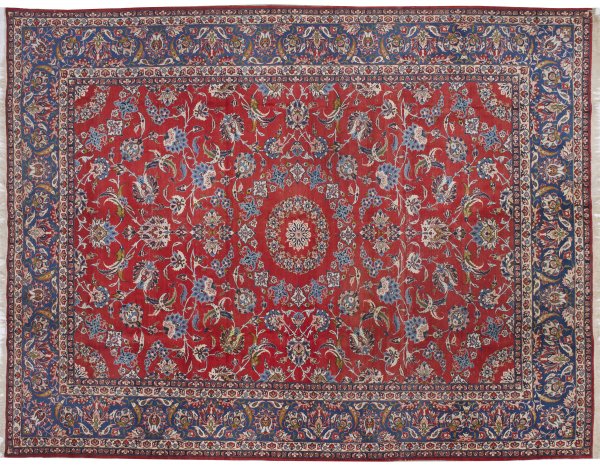 Großer Isfahan-Teppich Persien. Wolle auf Baumwolle. Im roten Innenfeld offen gestaltetes Medaillon aus Blüten sowie flächendeckende Musterung aus Palmettenranken. Umlaufend breite blaugrundige Bordüre aus Palmetten und Blattwerk flankiert von schmalen Nebenbordüren. 311 cm x 395 cm.