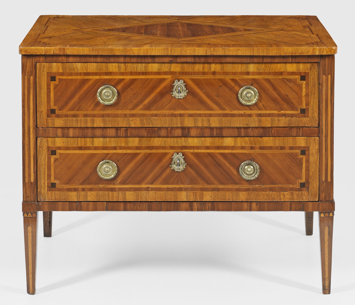 Louis XVI-Kommode Nussbaum und Pflaumenholz furniert. Gerader querrechteckig angelegter Korpus aus konischen Vierkantbeinen mit Scheinkanneluren. In der gegliederten Front zwei breite Schubladen. Gering überstehende Deckplatte mit großem Rautenfeld. Flächendeckend breit gerahmte Furnierfelder von Bandeinlagen begrenzt. H. 75 5 cm. 94 cm x 55 cm.