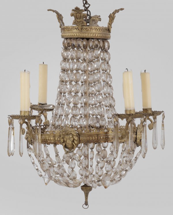 Kleiner Louis XVI-Deckenleuchter 4-flg.; Metall, goldfarben lackiert und farbloses Glas. Balusterförmiger Korpus aus Prismenschnüren im Verlauf. In der Mitte ornamentierter Reif aus Löwenmaskarons als Träger für geschwungene Leuchterarme. H. 49 cm. D. 45 cm.