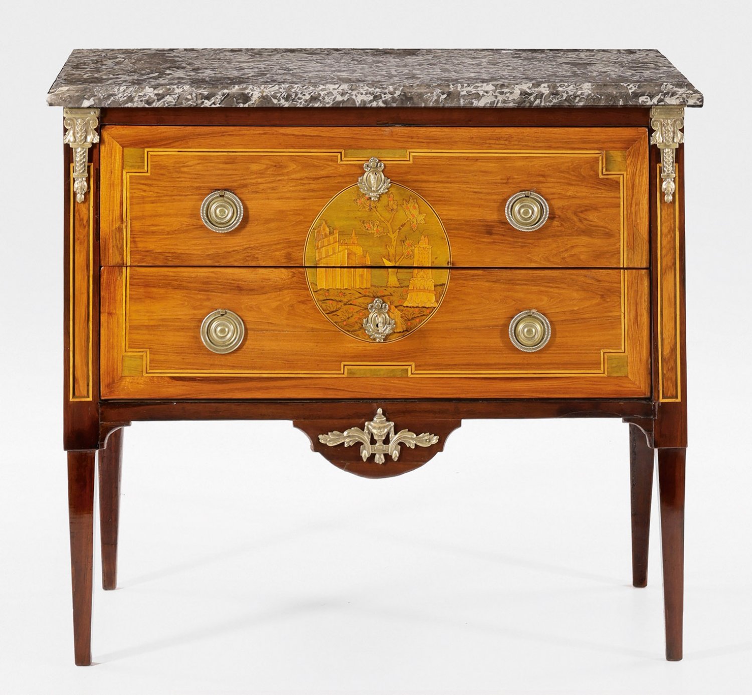 Signierte Louis XVI-Kommode von Jean-Louis François Legry Mahagoni und Rosenholz, furniert sowie Einlagen aus grün gefärbtem Ahorn. Gerader, querrechteckig angelegter Korpus auf konischen Vierkantbeinen. In der gegliederten Front zwei breite Schubladen sans traverse, optisch durch Intarsienmedaillon mit idealisierter Landschaftsdarstellung und ornamentierten Bändern verbunden. Schlagstempel-Sign. L*F*LEGRY (wird Meister 1779) sowie undeutl. Pariser Jury-Stempel JME. Korrespondierende Deckplatte aus dunkelgrauem, hellgrau gemasertem Marmor, rest.; H. 86 cm. 97 cm x 48,5 cm.