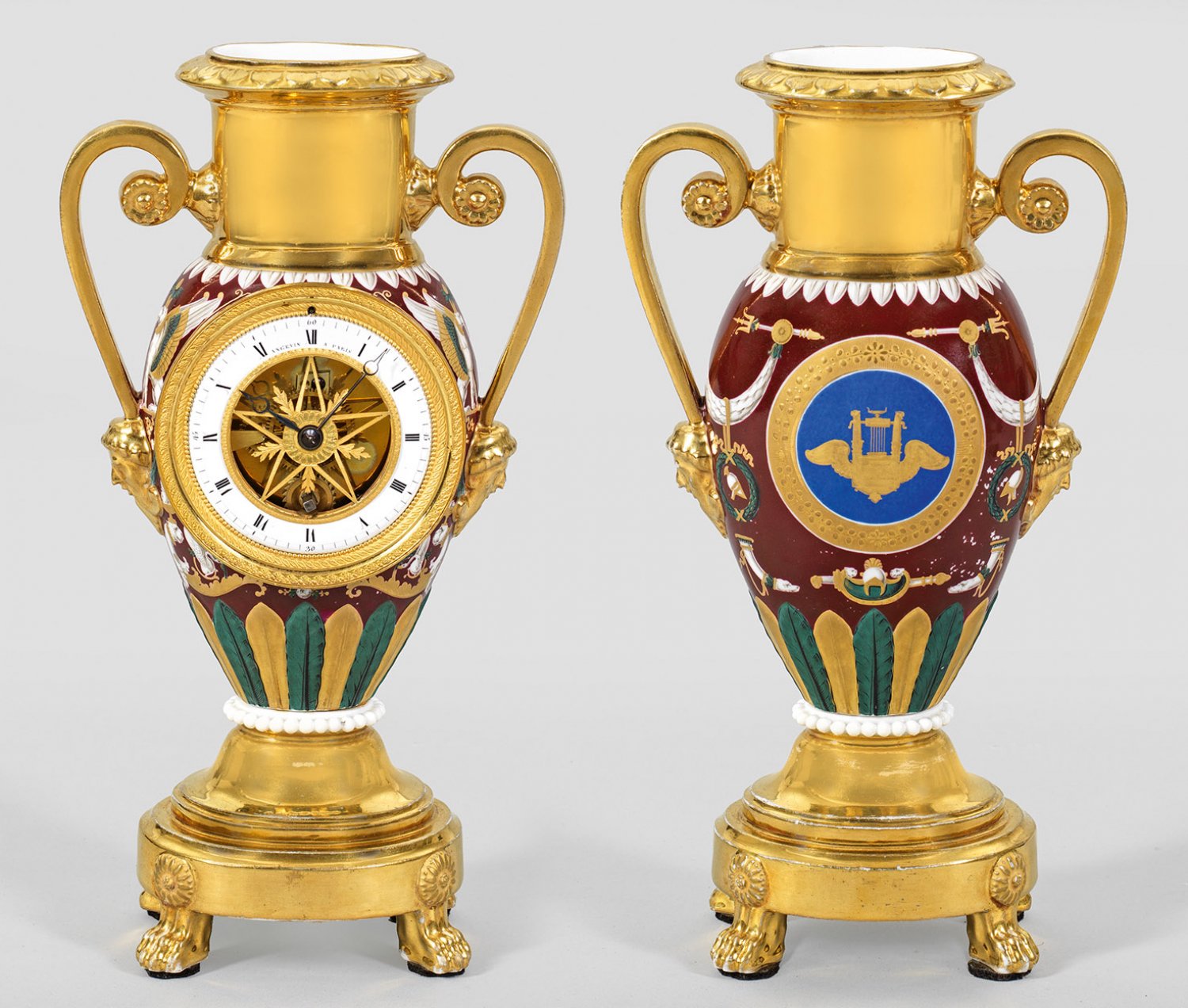 Seltene signierte Empire-Vasenuhr Porzellan. Amphorenform mit ovalem Querschnitt auf vier Löwenfüßen. Üppig vergoldet in Nachahmung von Goldbronze, Korpus dekoriert mit Trophäen und Sphingen vor dunkelrotem Fond, auf der Rückseite ein goldgerahmtes Medaillon mit Siegessymbol. Zifferblatt in Goldkranz eingefasst, römischer Ziffernring emailliert, Mittelfeld sternartig durchbrochen mit Durchblick auf das Uhrwerk. Sign. "Angevin ŕ Paris". Minim. ber.; H. 28,5 cm.