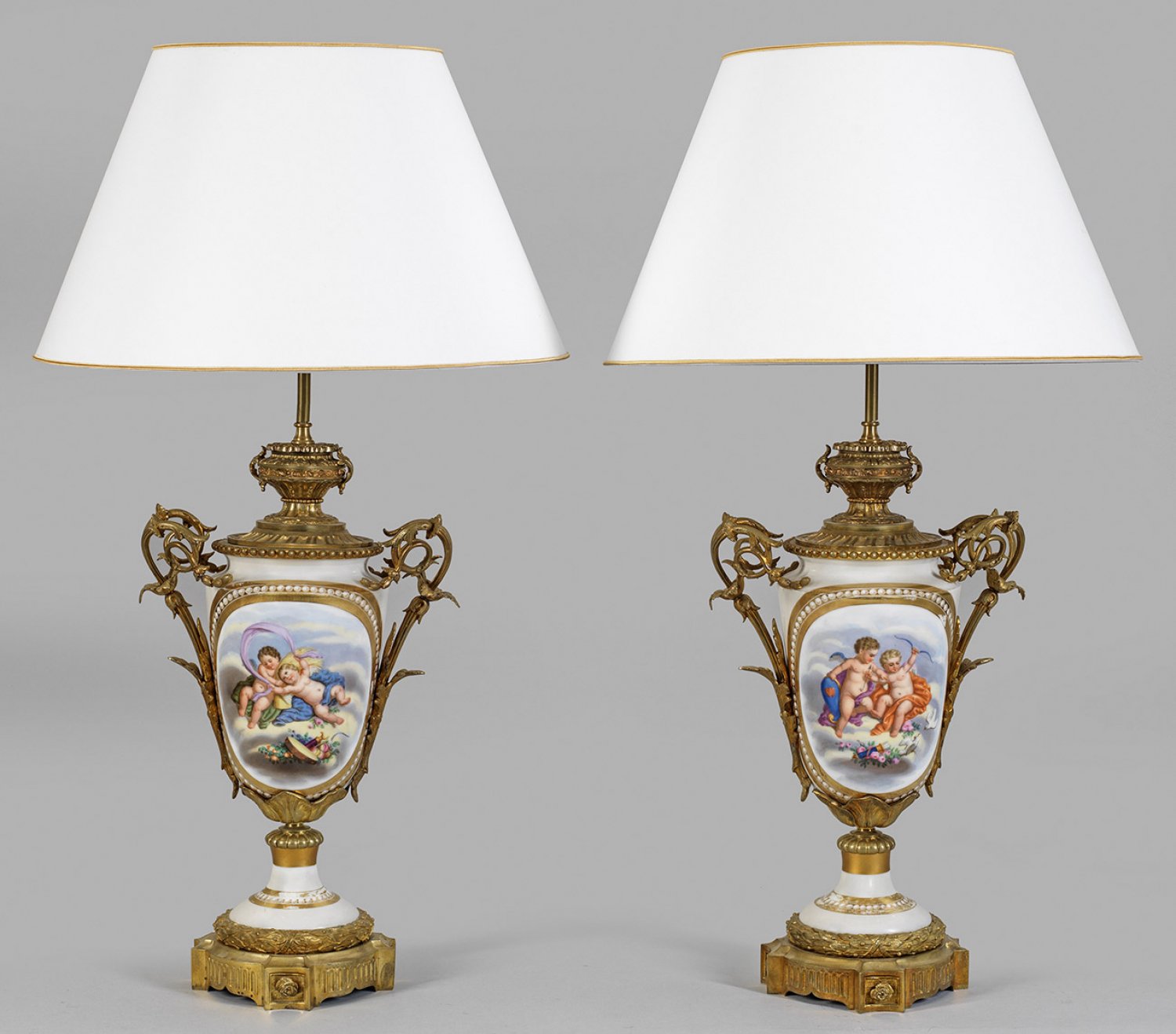 Paar Louis XVI-Tischlampen 1-flg.; Bronze, feuervergoldet. Porzellan. Runder, vierfach ausgezogener Sockel mit reliefiertem Lorbeerfries. Über Rundfuß ovoider Korpus mit abgesetztem, konkav einschwingendem Hals, in reliefplastisch verzierte, vasenförmige Bekrönung übergehend. Seitlich aufsteigende Handhaben in Form von eingerollten Blattvoluten. Beidseitig der Wandung große, goldradierte Ornamentreserve mit Perlschnur, darin auf Wolken schwebende Putti mit verschiedenen Attributen bzw. farbenprächtiges Blumenarrangement in polychromer Malerei. Konischer Lampenschirm. Elektrifiziert. Ges.- H. 85 cm.