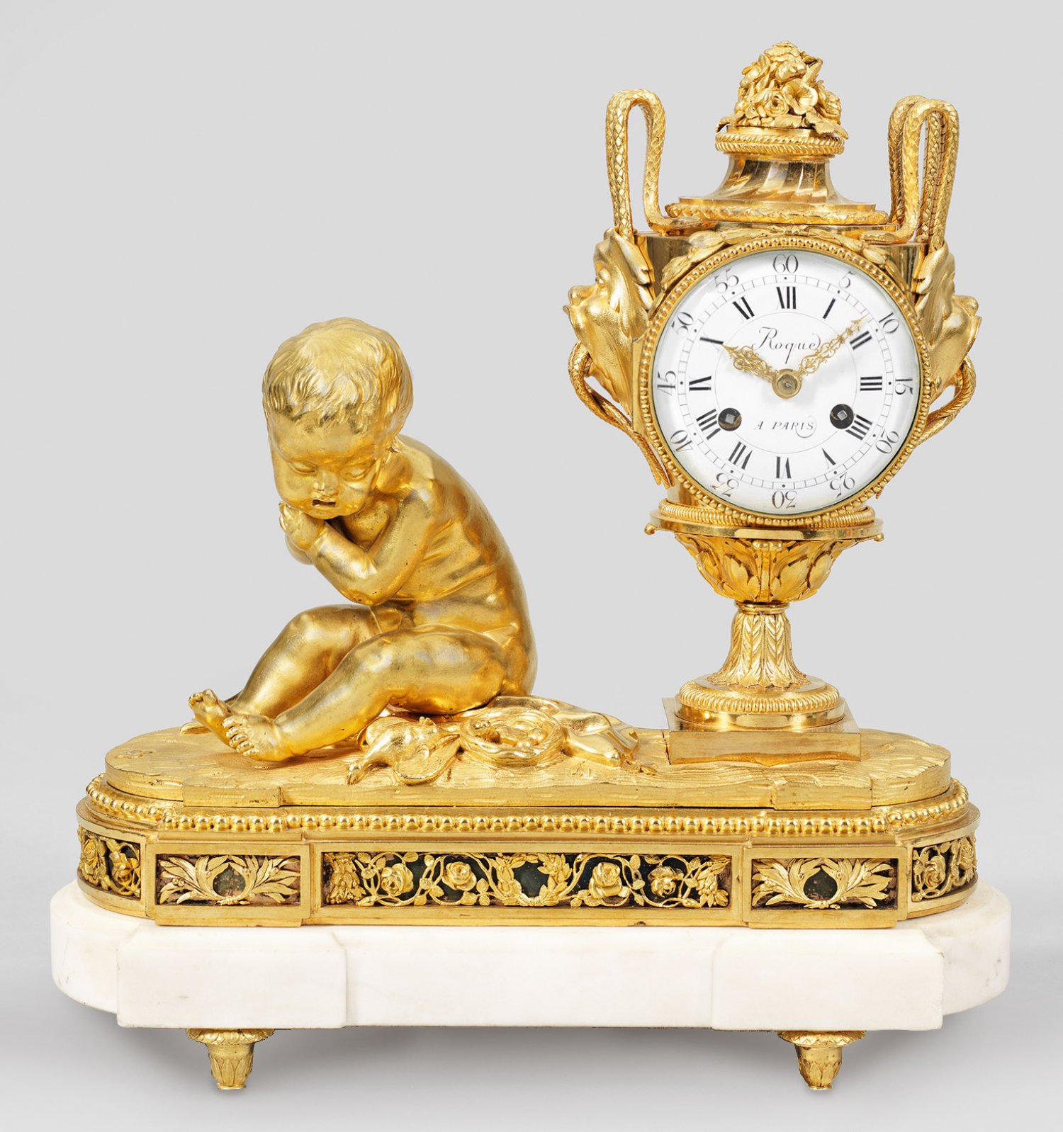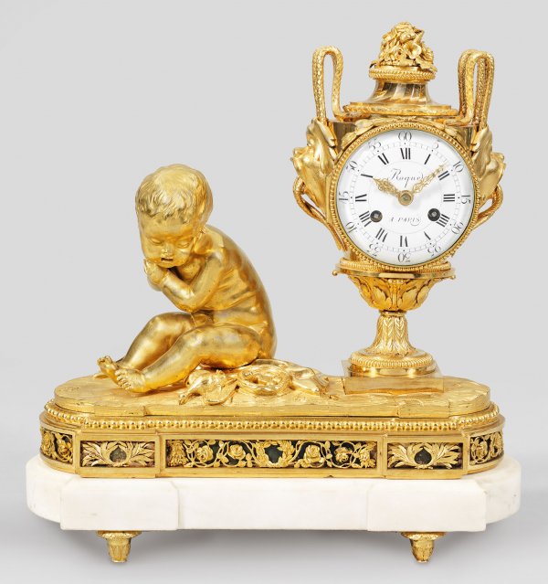 Feine Louis XVI-Figurenpendule Bronze feuervergoldet sowie weißer Marmor. Vollplastisch gestalteter Puttenknabe um einen toten Vogel trauernd. Daneben frisch geschlüpftes Vogelkind als Symbol für den Lauf der Zeit. Vasenförmiges Uhrengehäuse mit Blütenbekrönung sowie seitlichen reliefplastisch gestalteten Löwenmaskarons und hoch gebogten Henkeln aus Schlangenpaaren. Unterhalb gestuft ansteigender Sockel mit Rosenfries auf Balusterfüßen. Verglastes Emailzifferblatt bez. Roque ŕ Paris. Werk mit Miniaturpendel Fadenaufhängung sowie Halbstundenschlag auf Glocke. H. 35 cm. 33 5 cm x 14 cm.