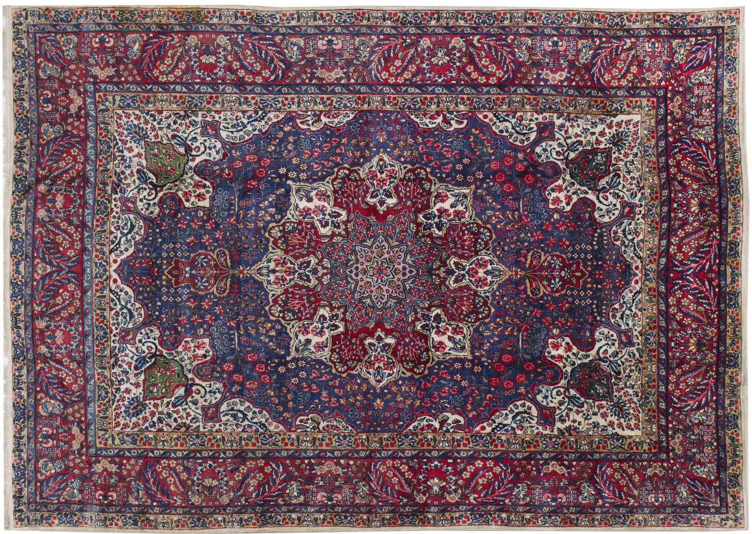 Großer alter Kirman-Teppich Persien. Um 1950. Wolle auf Baumwolle. Im blauen Innenfeld großes Zentralmedaillon mit Anhängern sowie breite passig geschweifte elfenbeinfarbene Ecklösungen. Flächendeckend dichte Musterung aus Blütenrispen und Dolden. Umlaufend breite rotgrundige Hauptbordüre aus üppigem Blattwerk flankiert von Nebenbordüren. 239 cm x 335 cm.