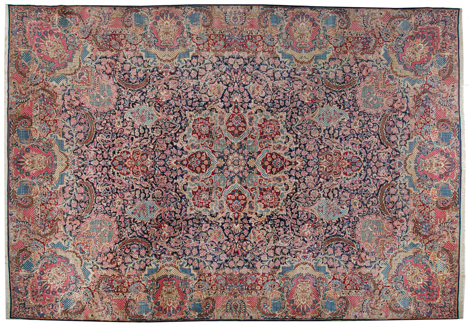 Alter Roomsize Kirman-Teppich Persien. Wolle auf Baumwolle. Im dunkelblauen Innenfeld großes Zentralmedaillon aus Blütendolden und Gitterwerk sowie flächendeckend dichte Musterung aus üppigen Blütenranken. Umlaufend breite Bordüre mit großen Vasenmotiven auf roséfarbenem Fond mit Gitterwerk. Fransen teilw. erg.; 490 cm x 344 cm.