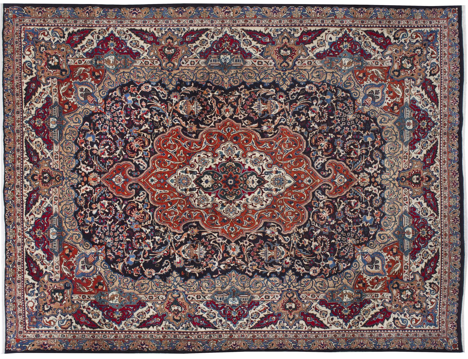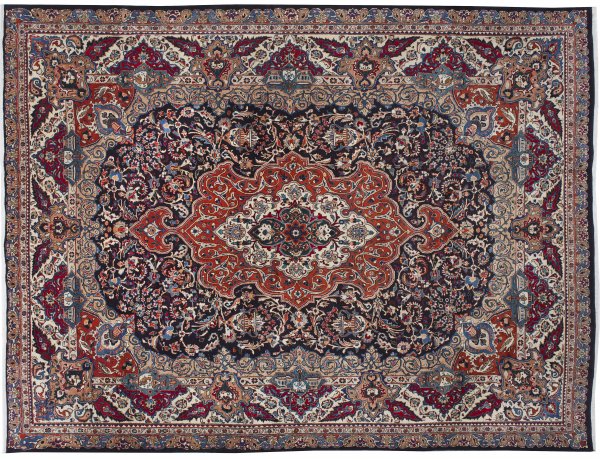 Großer Kaschmar-Teppich Persien. Wolle auf Baumwolle. Im tiefblauen Innenfeld gestrecktes elfenbeinfarbenes Medaillon auf großer rotgrundiger Reserve. Flächendeckend dichte Musterung aus Blattranken. Umlaufend breite Bordüre mit palmettenförmigen Reserven. 395 cm x 295 cm.