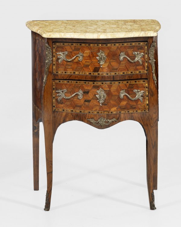 Kleine Louis XV-Kommode Palisander furniert. Dreiseitig bombierter Korpus flankiert von schmalen ausgezogenen Ecklisenen auf hohen leicht geschweiften Beinen. In der gegliederten Front zwei Schubfächer. Flächendeckende Furnierfelder aus Würfelmarketerie. Korrespondierende Deckplatte aus cremefarbenem Marmor. H. 79 cm. 63 cm x 34 cm.