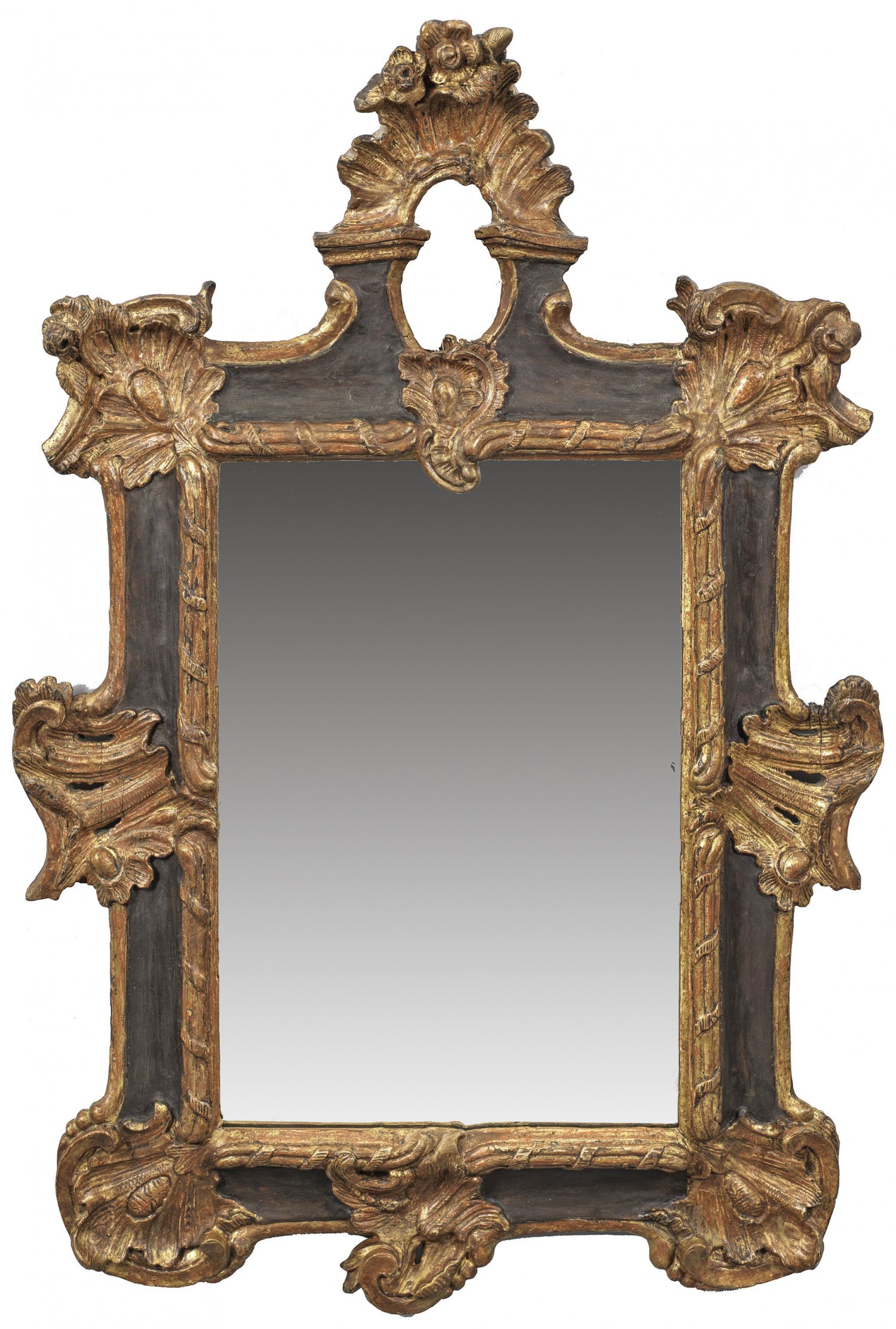 Barock-Wandspiegel Holz geschnitzt dunkelbraun gefasst und teilw. vergoldet. Hochrechteckige gekehlte Spiegelrahmung mit gebündelten Stäben sowie großen reliefierten Blattkartuschen. Hoch aufgeworfene durchbrochen gearbeitete Bekrönung aus Muschelwerk und Blüten. 83 cm x 55 cm.