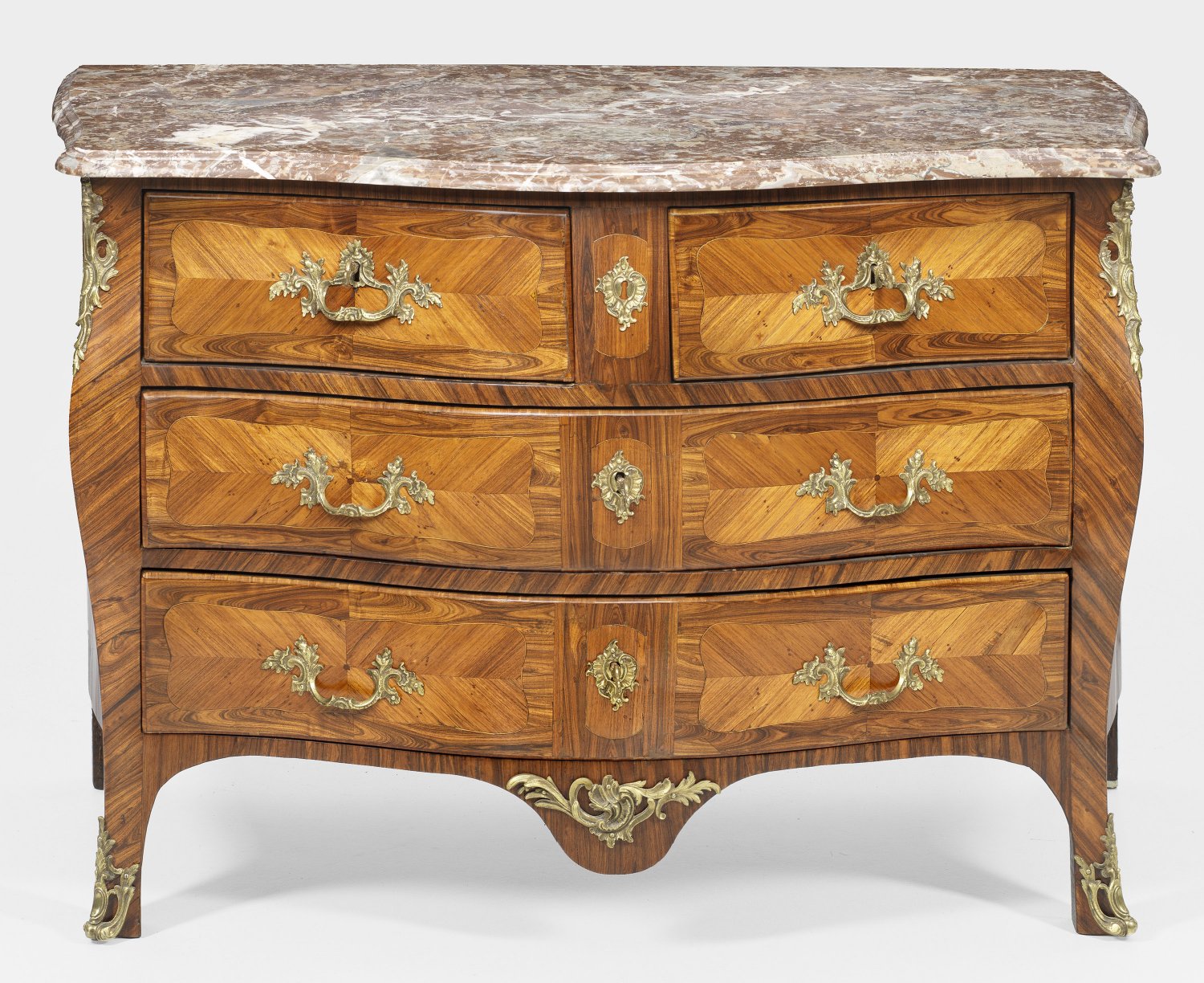 Signierte Louis XV-Kommode von Sébastien Vie Palisander furniert. Dreiseitig bombierter Korpus flankiert von schlanken leicht ausgezogenen Ecklisenen in ausgestellte Füße übergehend. In der gegliederten Front vier Schubladen unterschiedlicher Größe. Flächendeckend kartuschenförmige breit gerahmte und gespiegelt angeordnete Furnierfelder. Schlagstempel-Sig. S.VIE (wird Meister 1767) sowie Pariser Jury-Stempel JME. Korrespondierende profilierte Deckplatte aus rotbraunem weiß-grau gemasertem Marmor. H. 86 cm. 130 cm x 64 5 cm.