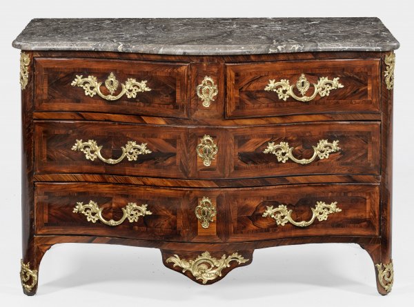 Große Louis XV-Kommode Palisander teilw. auf Eichenholz furniert. Gerader querrechteckig angelegter Korpus flankiert von gerundeten Ecklisenen. In der gegliederten Front vier geschweifte Schubladen unterschiedlicher Größe. Flächendeckend breit gerahmte gespiegelt angeordnete Furnierfelder. Gering überstehende profilierte Deckplatte aus grau-weiß gemasertem Marmor rest. H. 86 5 cm. 130 cm x 60 cm.
