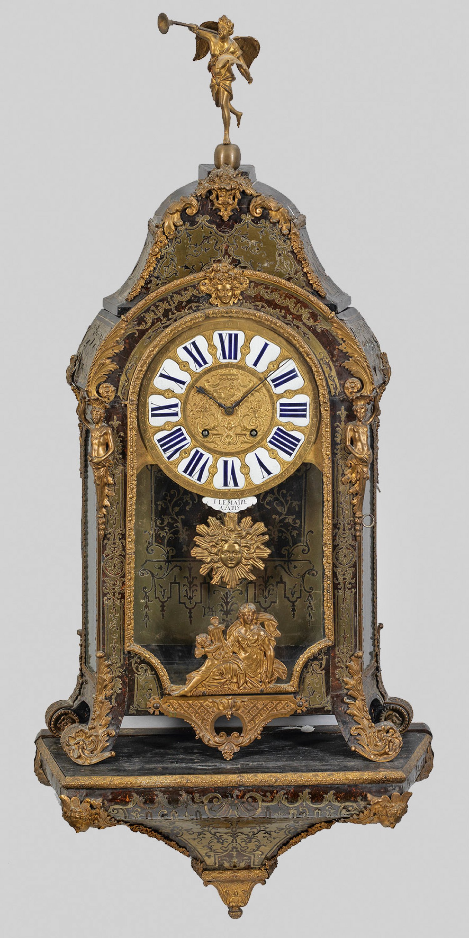 Große Louis XIV-Boulle Uhr mit Konsole Flächendeckender Fond aus Horn und ornamentiertem Messing in sog. Boulle-Technik. Hochrechteckiger, dreiseitig verglaster Korpus auf weit ausladenden Volutenfüßen mit segmentförmigem oberen Abschluss. Geschweift ansteigende Bekrönung mit vollplastisch gestalteter Fama. Ornamentiertes Zifferblatt aus Emailreserven, bez. I Le Maire ŕ Paris. Mechanisches Werk mit Pendelfeder sowie Halbstundenschlag auf Glocke. Korrespondierende Konsole, flankiert von Maskarons. Besch. und teilw. rep.; Ges.-H. 149 cm. 46 cm x 24 cm.