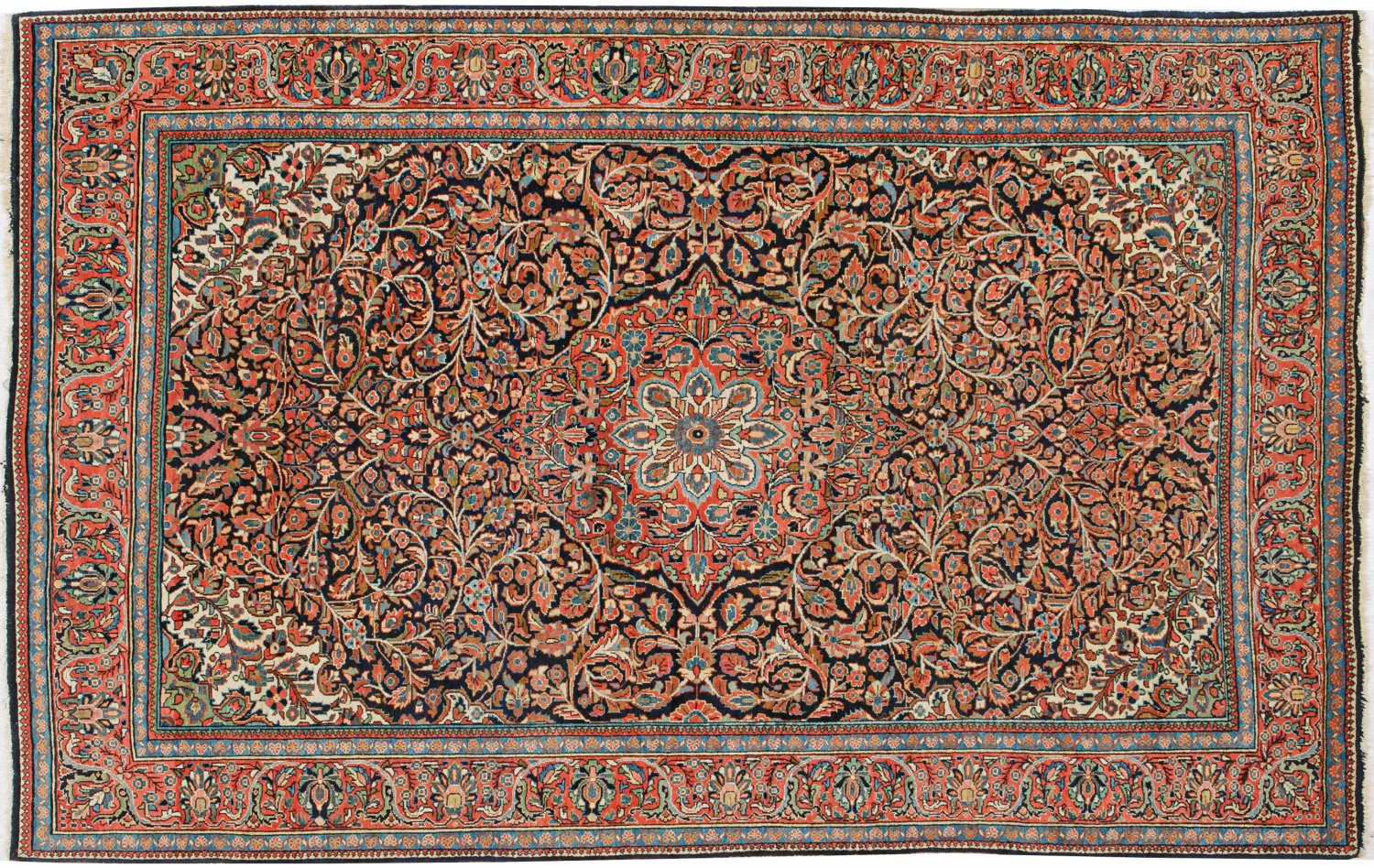 Alte Gaswin-Brücke Persien. Um 1950. Wolle auf Baumwolle. Feine Knüpfung. Auf dunklem Fond großes hellrotes Zentralmedaillon helle Ecklösungen sowie flächendeckend dichte Musterung aus üppigen eingerollten Blattranken. Umlaufend breite hellrote Bordüre aus Palmetten flankiert von schmalen Bändern. 200 cm x 130 cm.