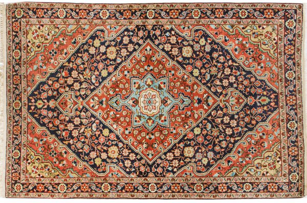 Sarough-Brücke Persien. Mitte 20. Jh.; Wolle auf Baumwolle. Auf dunkelblauem Fond großes, rotes Rautenmotiv mit Anhängern sowie hellblaues Zentralmedaillon. Breite Ecklösungen. Flächendeckende Musterung aus dichten Blütenranken sowie umlaufend schmale, korrespondierende Bordüre. Fransen erg.; 106 cm x 158 cm.