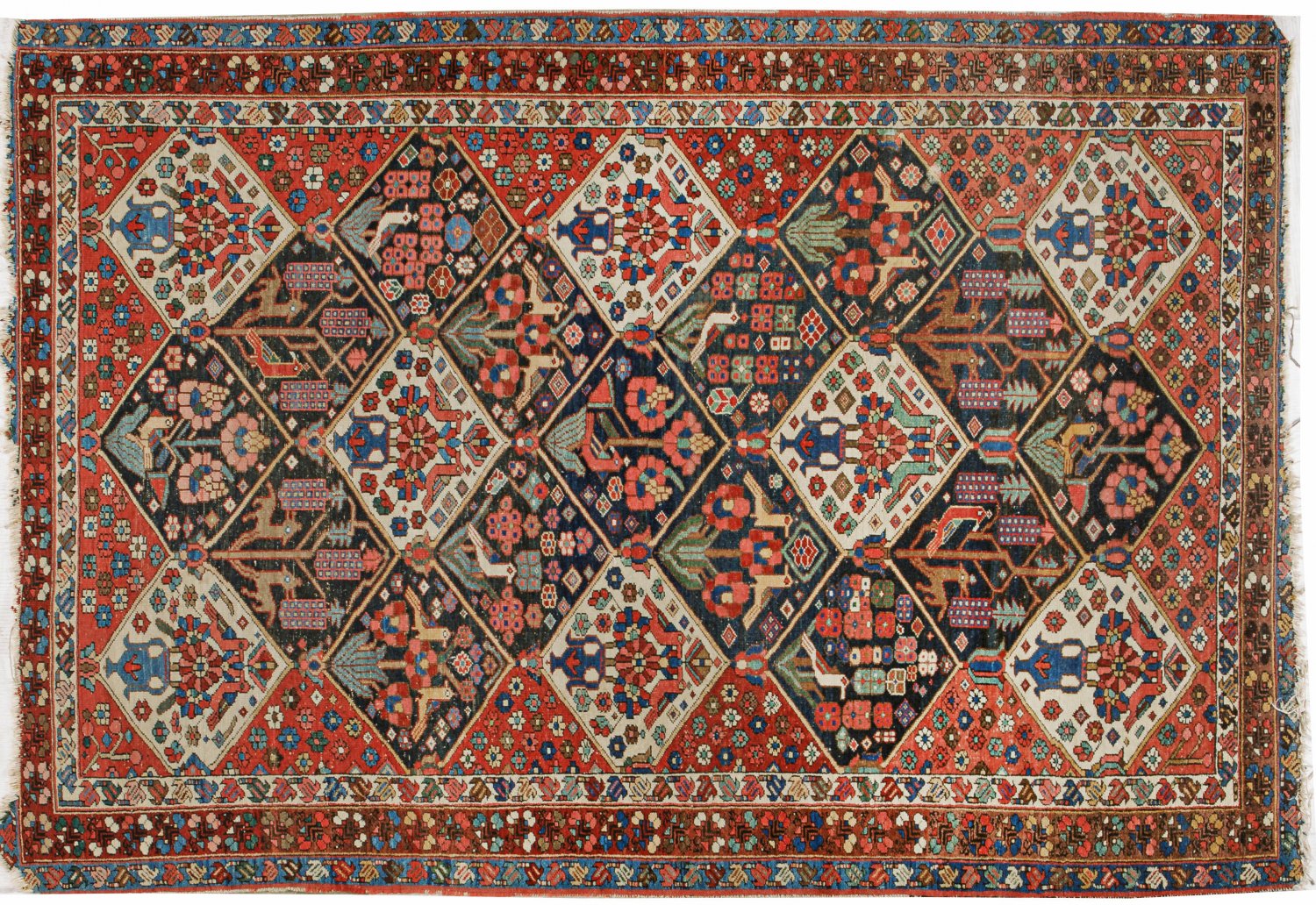 Antiker Felderteppich Persien. Wolle auf Baumwolle. Auf hellrotem Fond mit Rosettendekor flächendeckende Felder-Musterung aus dunkel bzw. hellgrundigen Rautenmotiven mit unterschiedlichen Blüten Wildtieren und Vögeln. Umlaufend mehrteilige Blütenbordüre. Altersspuren. Verkürzt. 206 cm x 143 cm.