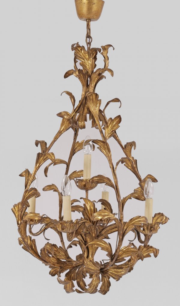 Deckenleuchter im Rokoko-Stil 5-flg.; Metall, goldfarben lackiert. Balusterförmiger Korpus aus geschwungenen Streben mit üppigem Blattwerk als Träger für zylinderförmige Tüllen. Kurze Kettenaufhängung. Elektrifiziert. Ges-H. 104 cm. D. 56 cm.