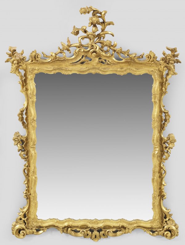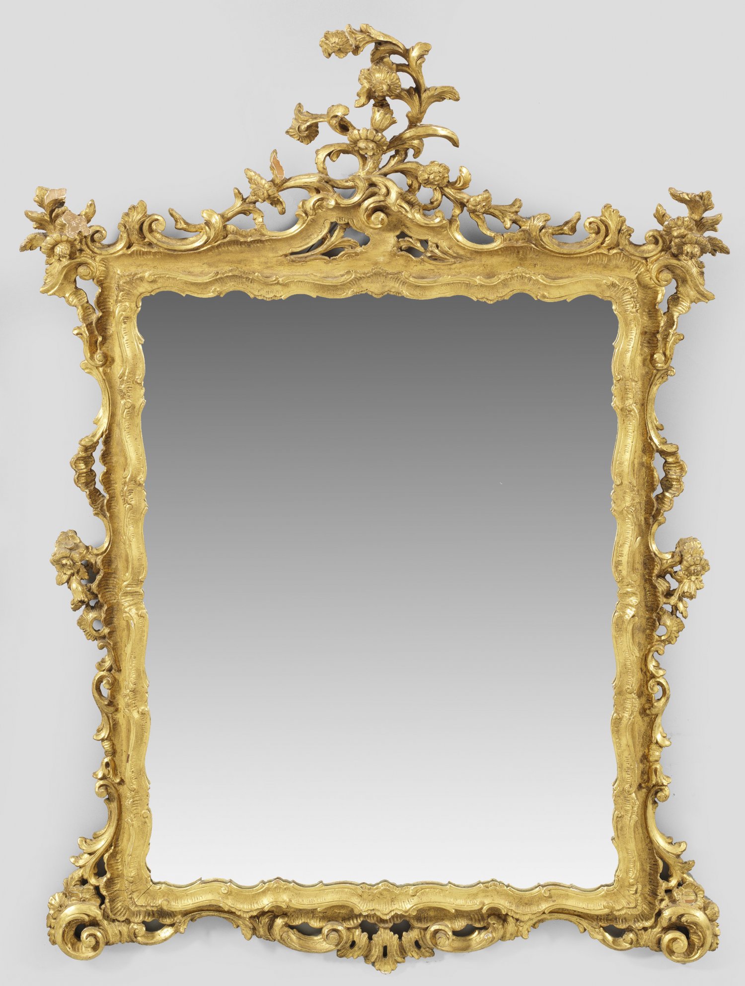 Großer Rokoko-Wandspiegel Holz, geschnitzt, gefasst und vergoldet. Rechteckige, passig geschweifte Spiegelrahmung aus Rocaillemotiven und Blüten mit volutenartigem unteren Abschluss. Durchbrochen gearbeitete, vorkragende Bekrönung aus üppigem, asymmetrisch angeordnetem Astwerk. Teilw. besch.; 123 cm x 89 cm.