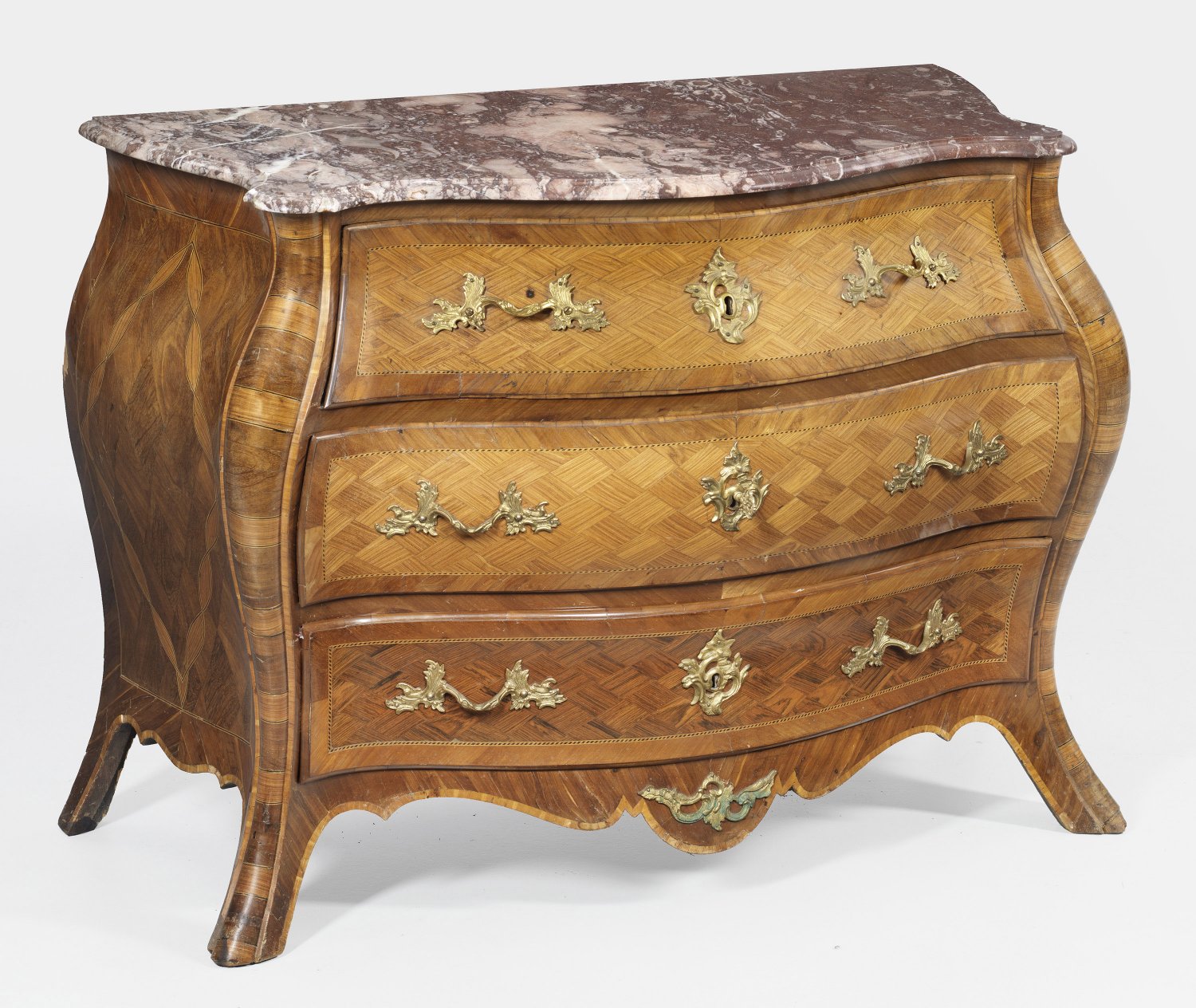 Rokoko-Kommode Nussbaum und Rosenholz, furniert. Dreiseitig stark bombierter Korpus mit passig geschweifter Zarge, flankiert von dick gewulsteten, weit ausgezogenen Ecklisenen. In der gegliederten Front drei breite Schubladen. Flächendeckend breit gerahmte Furnierfelder aus Rautenmarketerie, von feinen, schattierten Bandeinlagen begrenzt. Blattreliefierte Griffe aus vergoldeter Bronze. Profilierte Deckplatte aus rosérot gemasertem Marmor, rest.; H. 82,5 cm. 108 cm x 55 cm.
