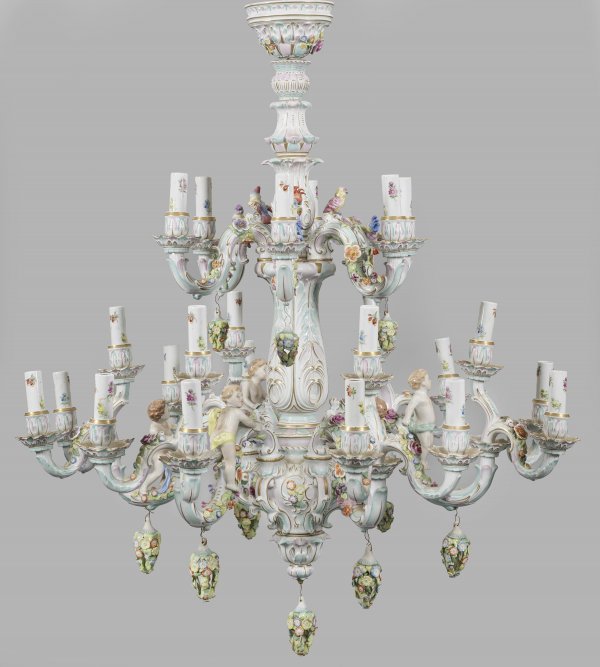 Großer Porzellan-Deckenlüster mit plastischem Dekor 24-flg.; Balusterförmiger, mehrfach gegliederter Schaft, umzogen von reliefplastischen Rocaillen und Akanthusblättern. Auf zwei Etagen jeweils sechs abnehmbare, geschweifte und von fein modellierten Blütenranken umzogene Leuchterarme mit vollplastisch gearbeiteten Figuren von Putten und exotischen Vögeln, oberhalb in sechs und unterhalb in 18 vasenförmigen Tüllen über blattartiger Traufschale endend. Unterhalb tropfenförmig herabhängende, plastisch gearbeitete Blumenbuketts. Polychrome Malerei mit reicher Goldstaffage. Minim. best./rest.; Manufakturmarke. Schaft-H. ca. 90 cm. D. ca. 97 cm.