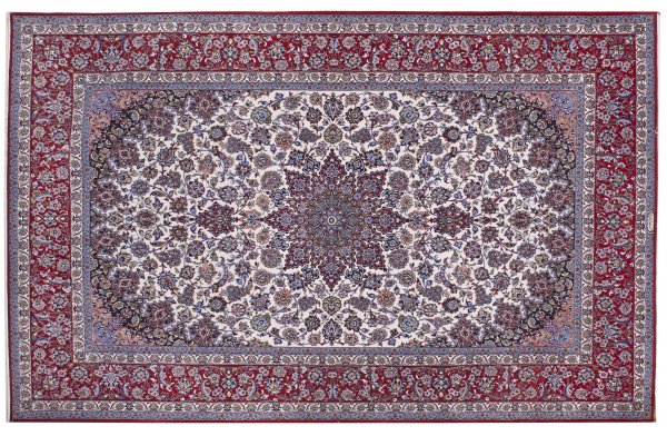 Großer Isfahan-Teppich Persien. Korkwolle auf Seide. Im elfenbeinfarbenen Innenfeld großes sternförmiges Medaillon mit Anhängern sowie schmale Ecklösungen. Flächendeckend dichte Musterung aus Rankenwerk. Umlaufend breite rotgrundige Blütenbordüre flankiert von schmalen Nebenbordüren in Hellblau und Elfenbein. 210 cm x 326 cm.